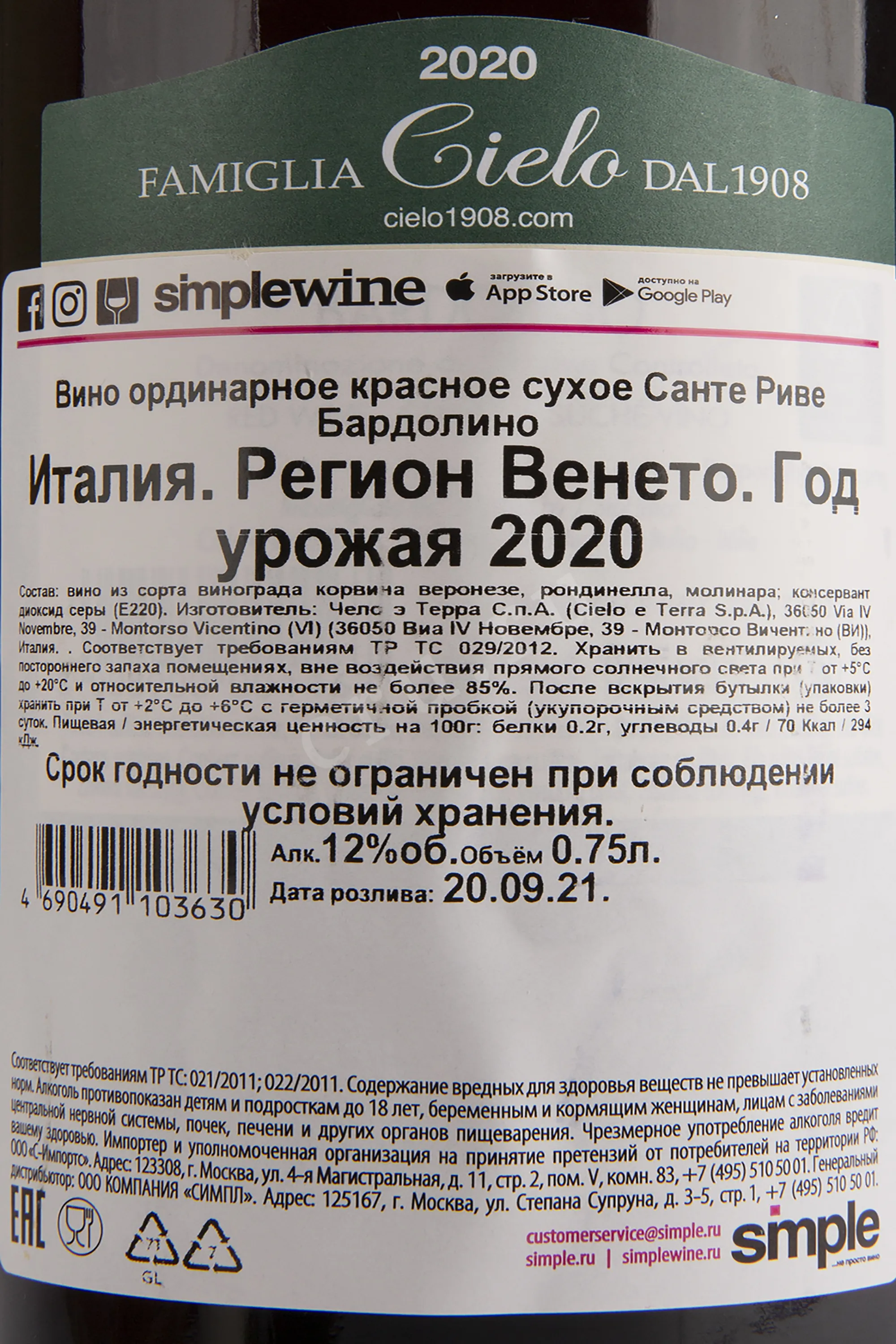 Вино Sante Rive Bardolino 0.75 л - красное сухое итальянское вино из региона Бардолино с освежающим летнем ароматом. После сбора урожая ферментация осуществляется в резервуарах из нержавеющей стали при контролируемой температуре. После этого напиток выдерживают в ёмкостях из нержавеющей стали.