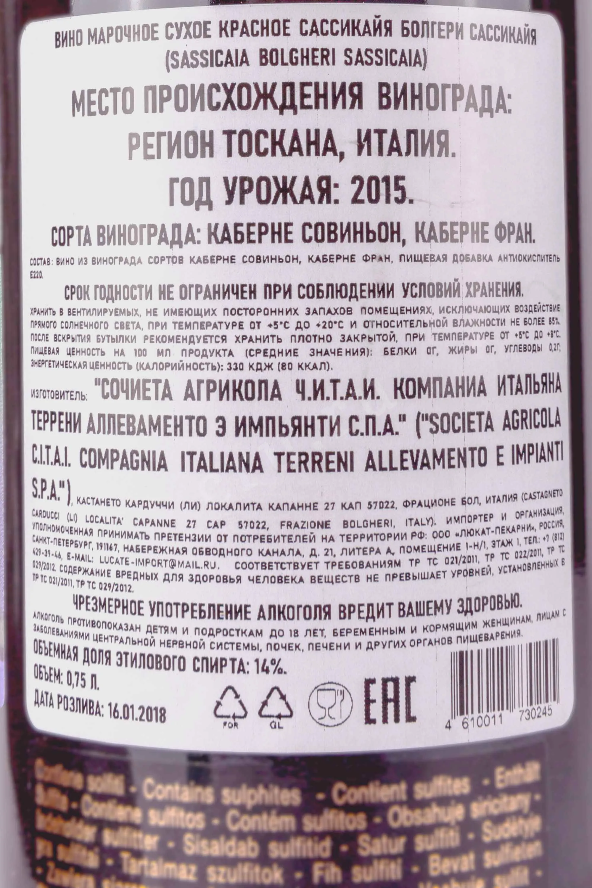Sassicaia 2015 0.75 л купить - Итальянское вино Сассикайя цена в магазине г. Москва, ул. Профсоюзная, д. 16/10 10:00-22:00 Ежедневно +7 (495) 920-20-02 info@cru.ru