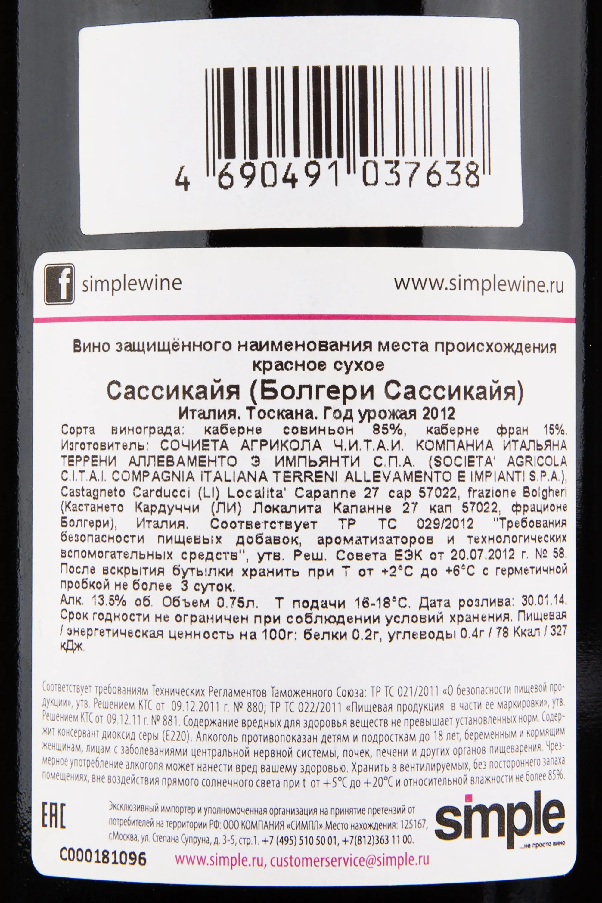 Sassicaia Bolgheri Sassicaia red dry 2012 0.75 л купить - Итальянское вино Сассикайя Болгери красное сухое цена в магазине г. Москва, ул. Профсоюзная, д. 16/10 10:00-22:00 Ежедневно +7 (495) 920-20-02 info@cru.ru