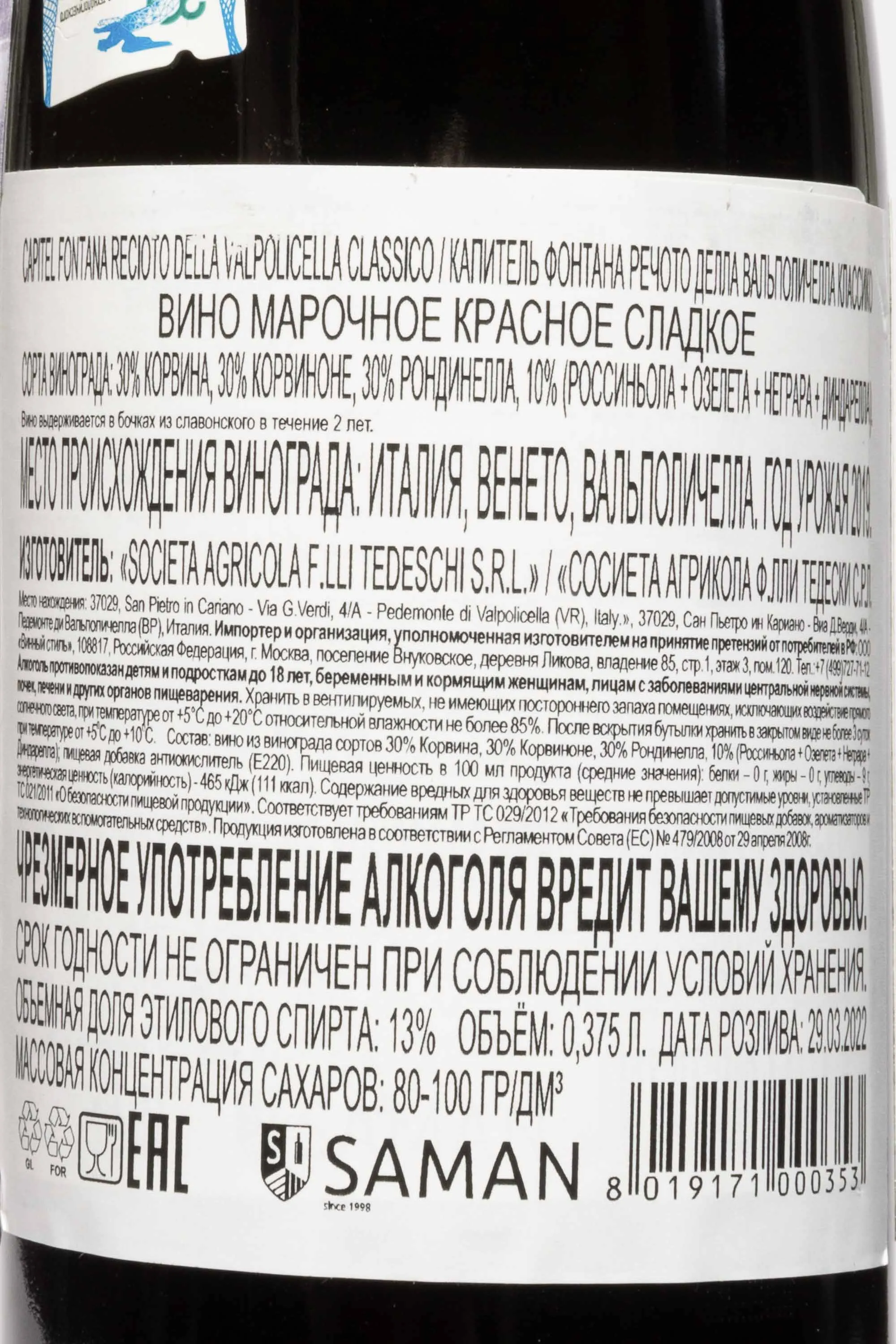 Tedeschi Capitel Fontana Recioto Della Valpolicella Classico DOCG 2019 0.375 л купить - Итальянское вино Тедески Капитель Фонтана Речото Делла Вальполичелла Классико ДОКГ цена в магазине г. Москва, ул. Профсоюзная, д. 16/10 10:00-22:00 Ежедневно +7 (495) 920-20-02 info@cru.ru