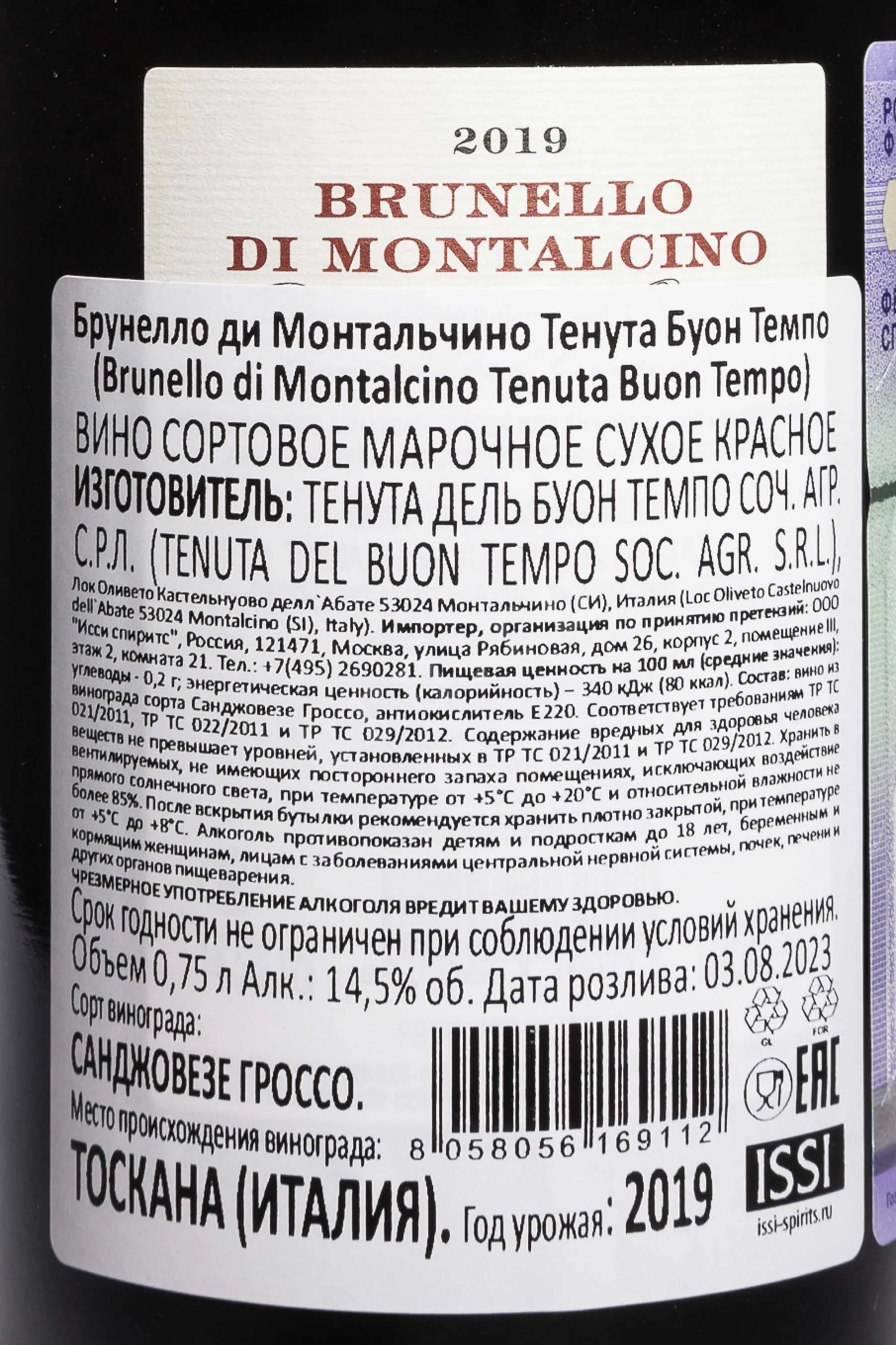 Красное сухое вино Tenuta Buon Tempo Brunello Di Montalcino DOCG 2019 года 0,75 л — это выдающийся пример тосканского виноделия, созданный исключительно из сорта Санджовезе, который идеально передает характер зоны Монтальчино. Виноградники расположены в районе Кастельнуово-дель-Абате, на высоте 300-350 метров над уровнем моря, с юго-восточной экспозицией, что способствует максимальному солнечному обогреву. Урожай был собран вручную с низкой урожайностью, не превышающей 1 кг с лозы, что способствовало высокой концентрации ароматических и вкусовых компонентов в ягодах. Виноград растет в терруарах с почвами из галестро и аренарии, придающими вину минерализацию и плотность. Ферментация происходила в стальных резервуарах при контролируемой температуре, а мацерация длилась 4 недели, раскрывая аромат и танинную структуру. После этого вино несколько лет выдерживали в дубовых бочках, что придало ему элегантность и глубину. Винтаж 2019 года получил по 94 балла из 100 возможных от Wine Enthusiast и James Suckling, а также 17/20 от Jancis Robinson.