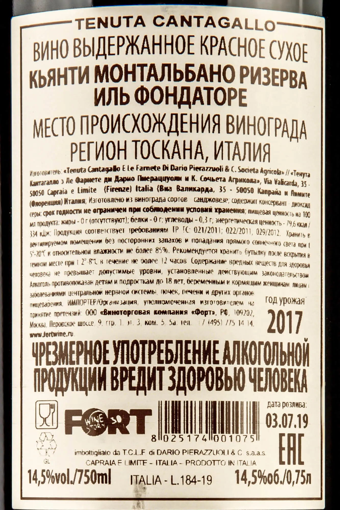 Тенута Кантагалло Кьянти Монтальбано Ризерва Иль Фондаторе 2017 0.75