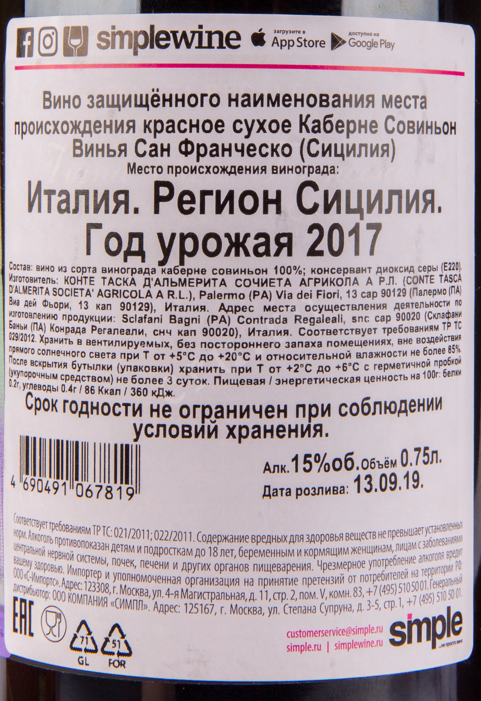 Вино Tasca d'Almerita Vigna San Francesco Cabernet Sauvignon 2017 0.75 л купить - Итальянское вино Таска д'Альмерита Винья Сан Франческо Каберне Совиньон цена в магазине г. Москва, ул. Профсоюзная, д. 16/10 10:00-22:00 Ежедневно +7 (495) 920-20-02 info@cru.ru