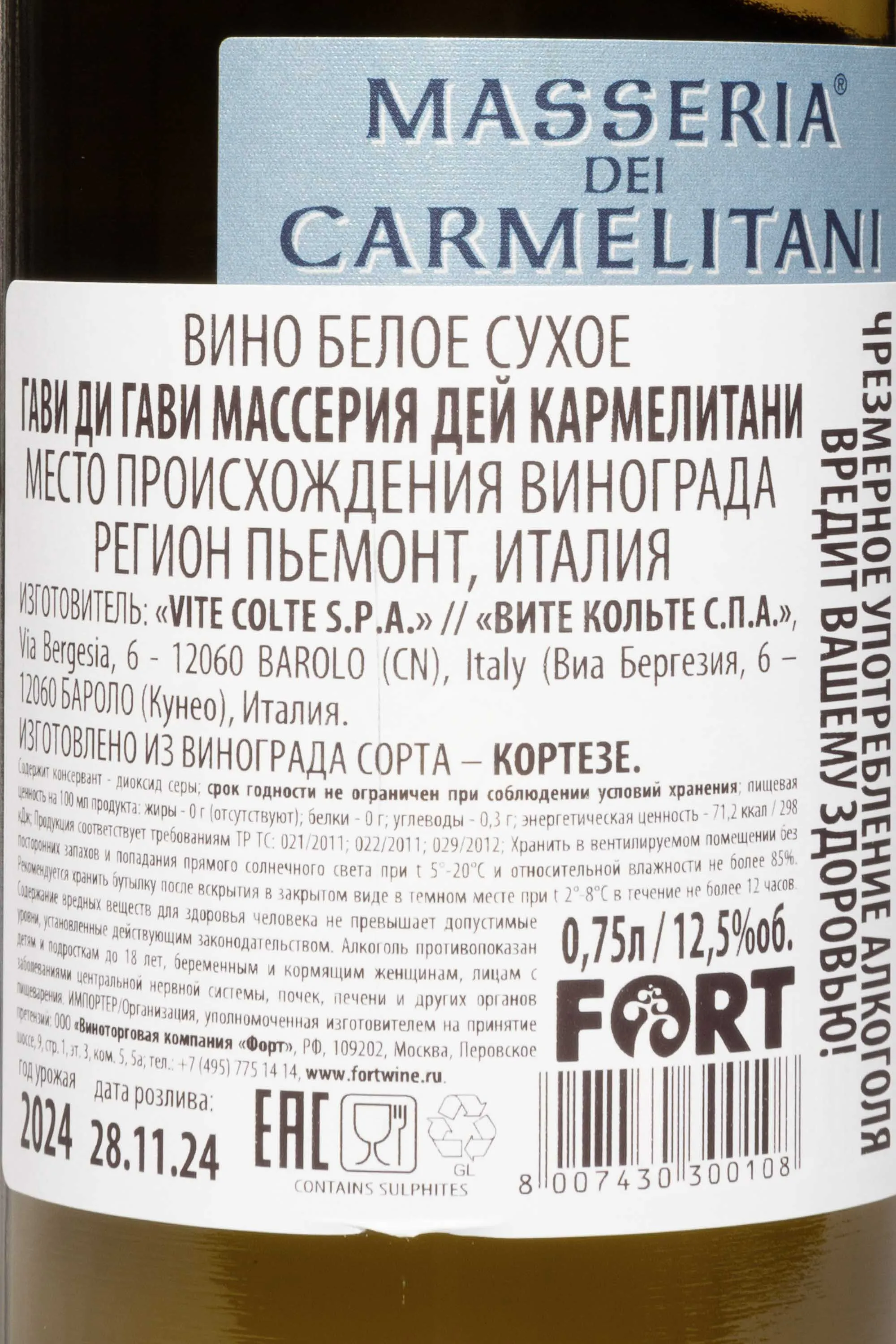 Вино Terre da Vino Masseria dei Carmelitani Gavi di Gavi 2020 г. 0.75 l – это моносортовой итальянский винтаж, выпускаемый в регионе Пьемонт. Сразу после сбора урожая ягоды отправляют под пресс, а полученный сок сбраживают. Ферментация протекает в стальных емкостях при температуре 16-17 °С в течение 10 дней. Чтобы сохранить кислинку, белое сухое вино не проходит яблочно-молочное брожение. Перед розливом напиток крепостью 12.5% выдерживается в чанах из нержавеющей стали.