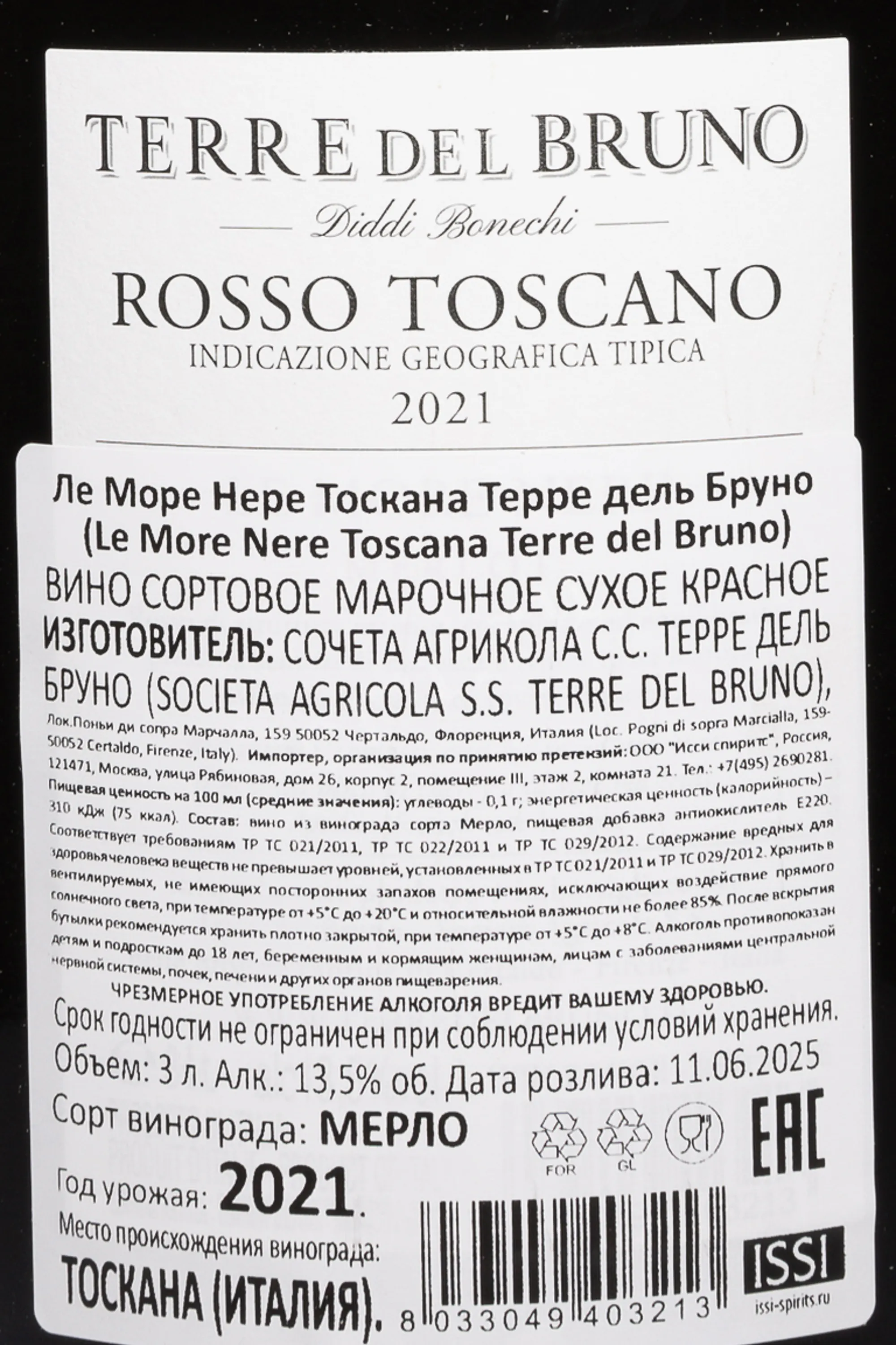 Красное сухое вино Terre del Bruno Le More Nere Toscana IGT в деревянной коробке 2021 года 3 л демонстрирует полнотелость, выразительность и насыщенный профиль с яркими сортовыми чертами Мерло. Его выращивают на холмистых участках Тосканы на высоте около 500 метров. Средний возраст лоз — 16 лет, плотность посадки высокая, что повышает концентрацию вкуса. Урожай 2021 года считается удачным: лето было теплым и ровным, что обеспечило равномерное созревание. Ягоды собирали вручную с конца августа по первые числа сентября. Их отделили от гребней и мягко прессовали, затем сусло ферментировали в стальных резервуарах при температуре около 28 °C. Мацерация продолжалась 2 недели. Яблочно-молочное брожение проходило в стали и завершилось к декабрю. Выдержка в новых французских барриках длилась около 20 месяцев, после чего вино год отдыхало в бутылках.