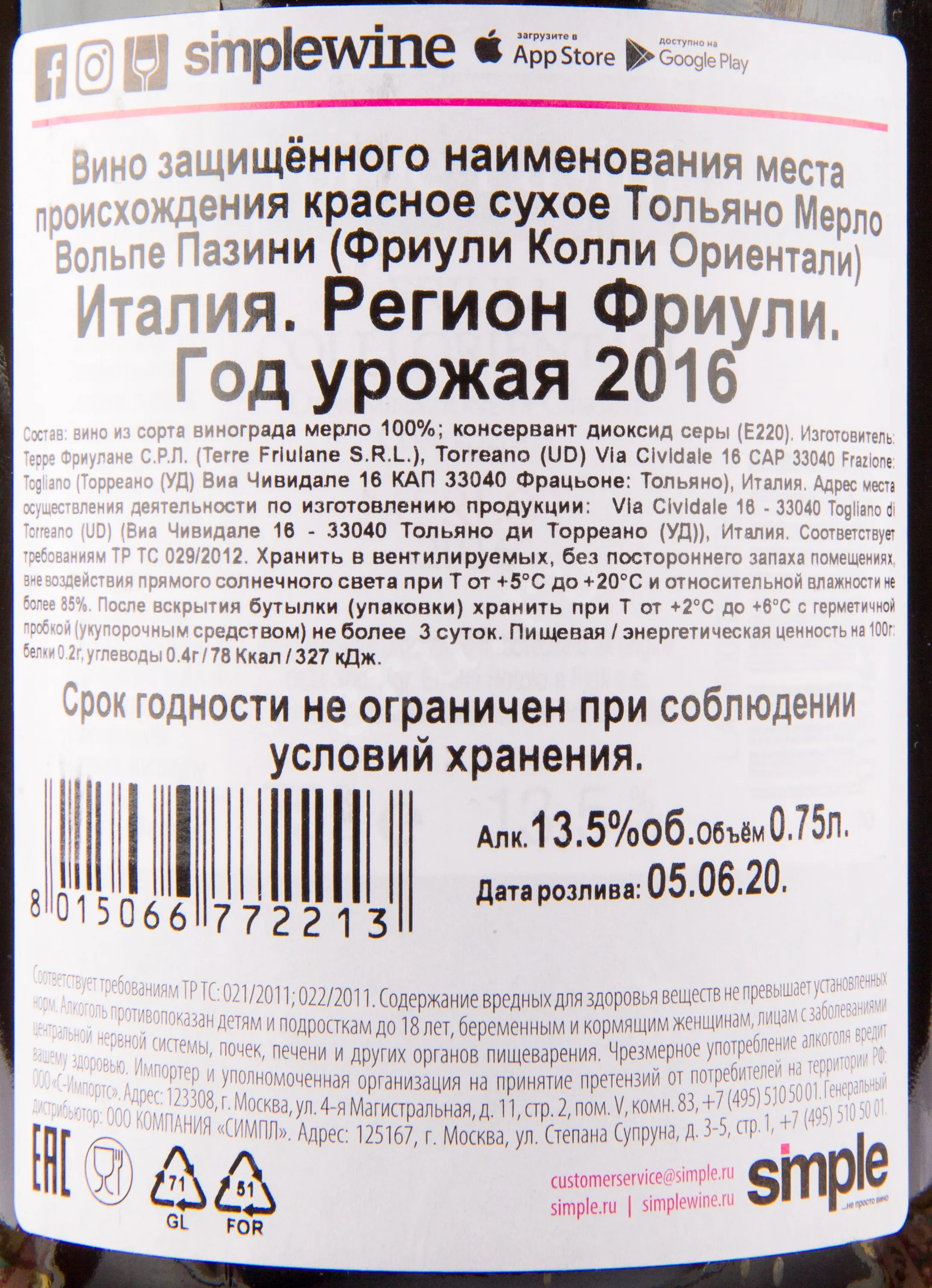 Togliano Merlot Volpe Pasini 0.75 л - красное итальянское сухое вино из региона Фриули-Венеция-Джулия, сделанное с французским акцентом, которое производится из сорта винограда Мерло. После сбора, перед прессованием, ягоды охлаждают при помощи сухого льда. После идет непродолжительная холодная мацерация и ферментация в стальных емкостях при контролируемой температуре. Выдержка проходит частично в маленьких дубовых бочках и частично в стальных резервуарах. Потенциал хранения вина 5 лет.