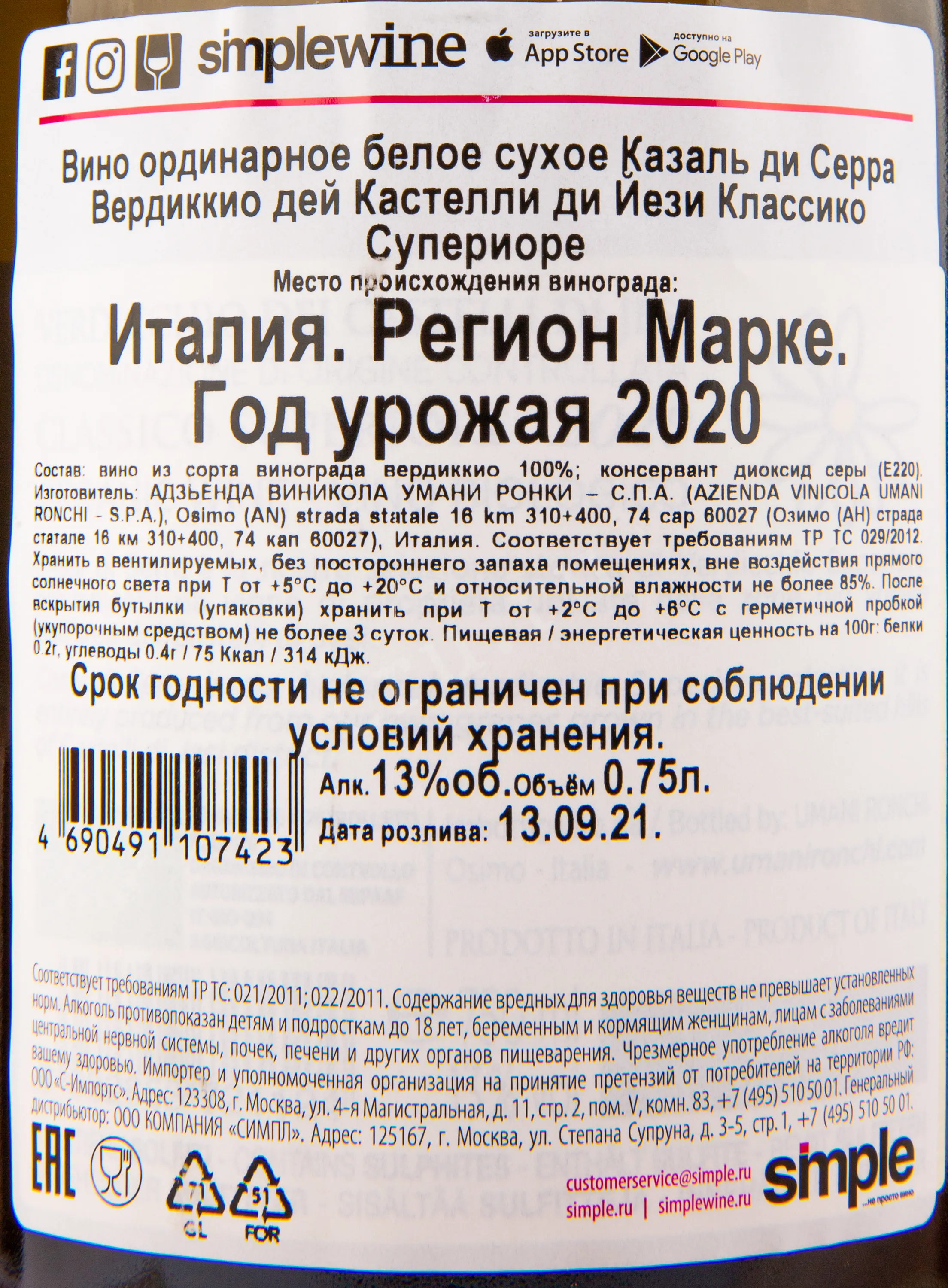 - Сорт винограда: Вердиккио 100%.