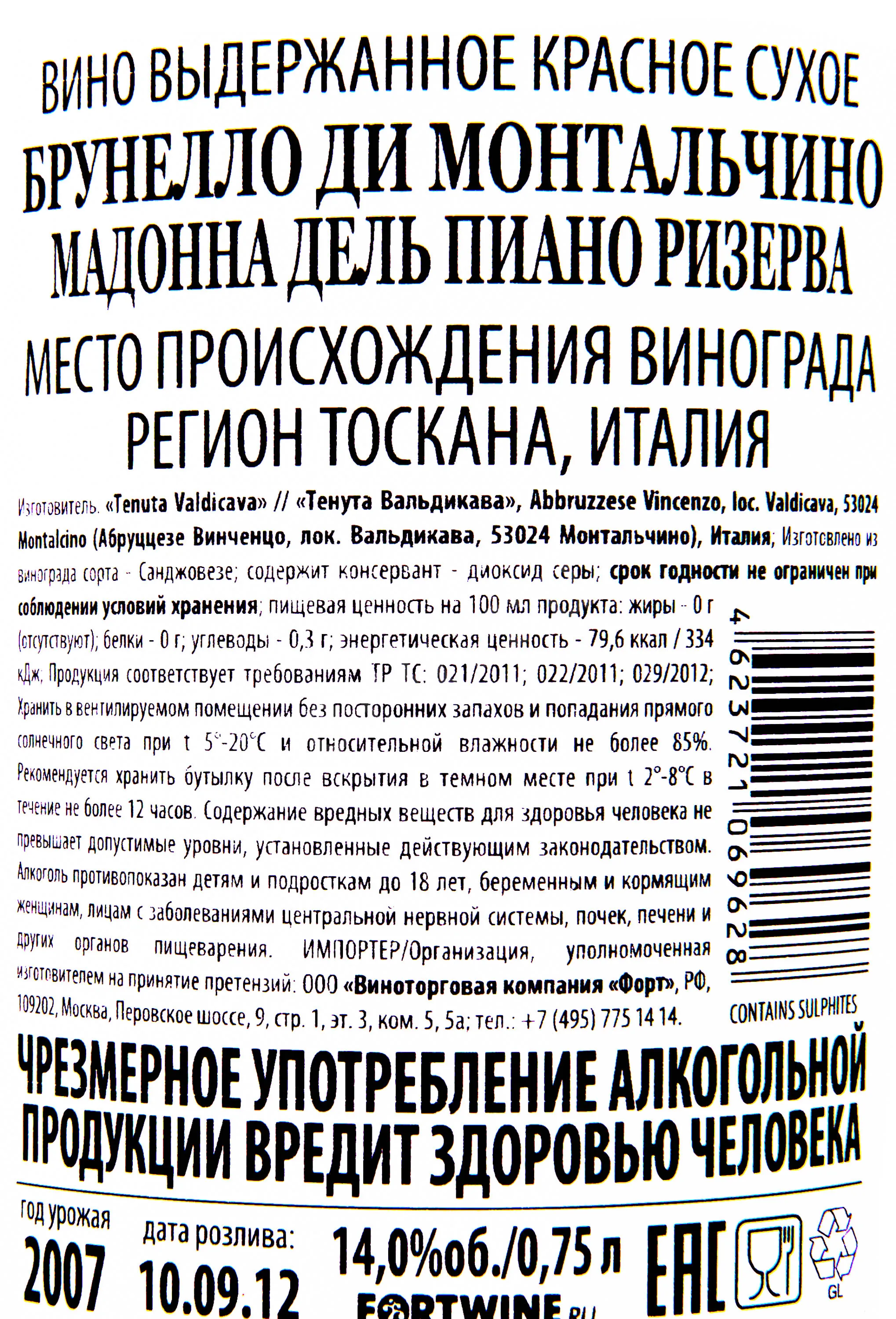 Красное сухое вино Valdicava Brunello di Montalcino Madonna del Piano Riserva DOCG 2007 0.75 l создано из тосканского винограда одного года сбора. Моносортовой алкоголь имеет высшую категорию качества и контролируется по месту происхождения и способу производства. Лозы, средний возраст которых составляет 40-50 лет, произрастают на винограднике Madonna del Piano. Напиток созревал в течение 4.5 лет в дубовых тарах из славонского дуба, а в сентябре 2012 годы был разлит по бутылкам. Изысканное 14-процентное вино получило высокие 98 баллов от известного критика Джеймса Саклинга.