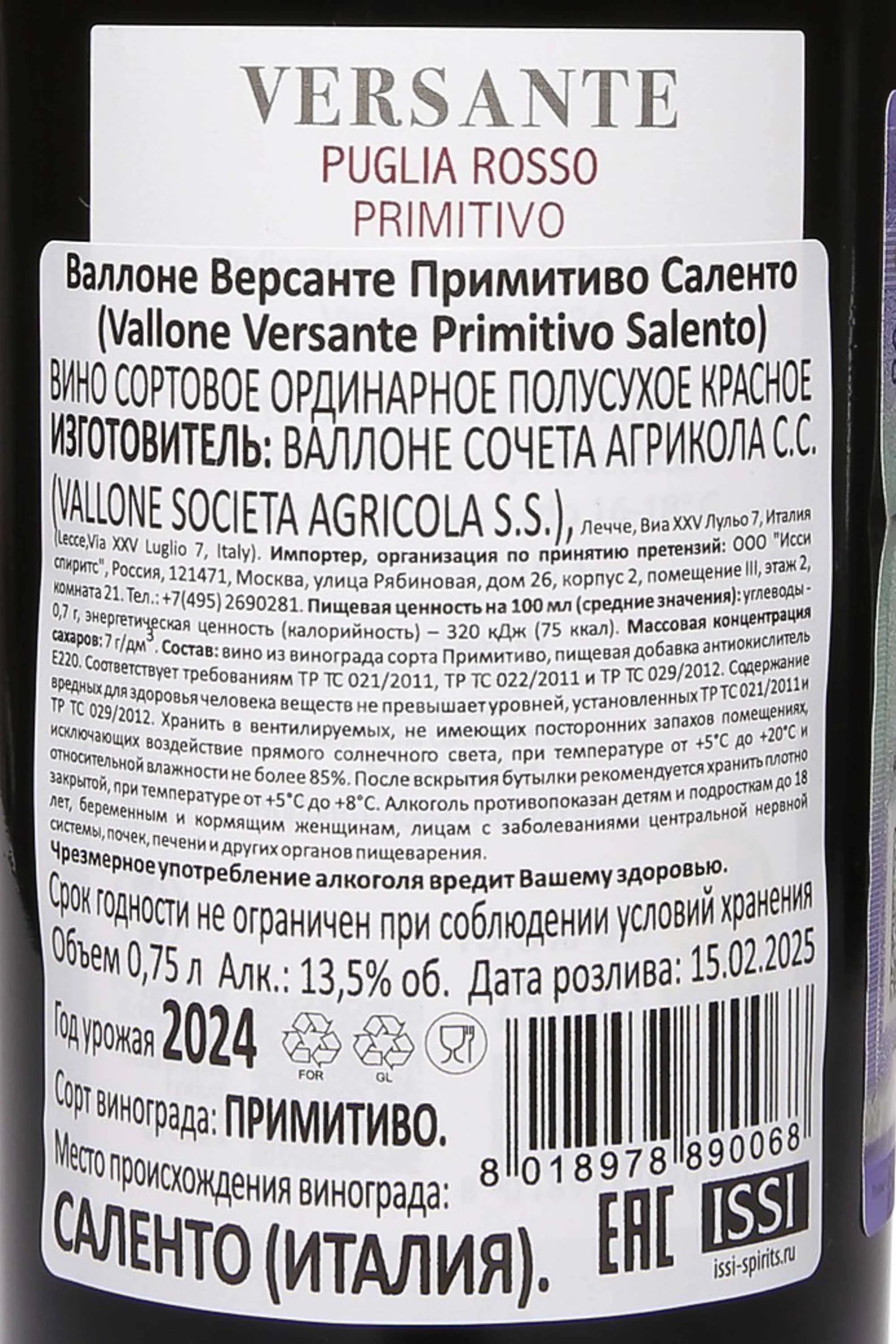 Вино Vallone Versante Primitivo Salento IGP 2023 0.75 л рождается на солнечных виноградниках Апулии, расположенных на известняковых и глинистых почвах, богатых минералами и прекрасно удерживающих влагу. Практикуется ручной сбор винограда в утренние часы, чтобы сохранить его свежесть и избежать преждевременной ферментации ягод. После бережного прессования сусло подвергается медленной ферментации при контролируемых температурах, что позволяет сохранить утонченность аромата и подчеркнуть выразительный характер напитка. Затем следует непродолжительная выдержка в емкостях из нержавеющей стали, обеспечивающая чистоту вкуса и сочность оттенков фруктов и ягод.