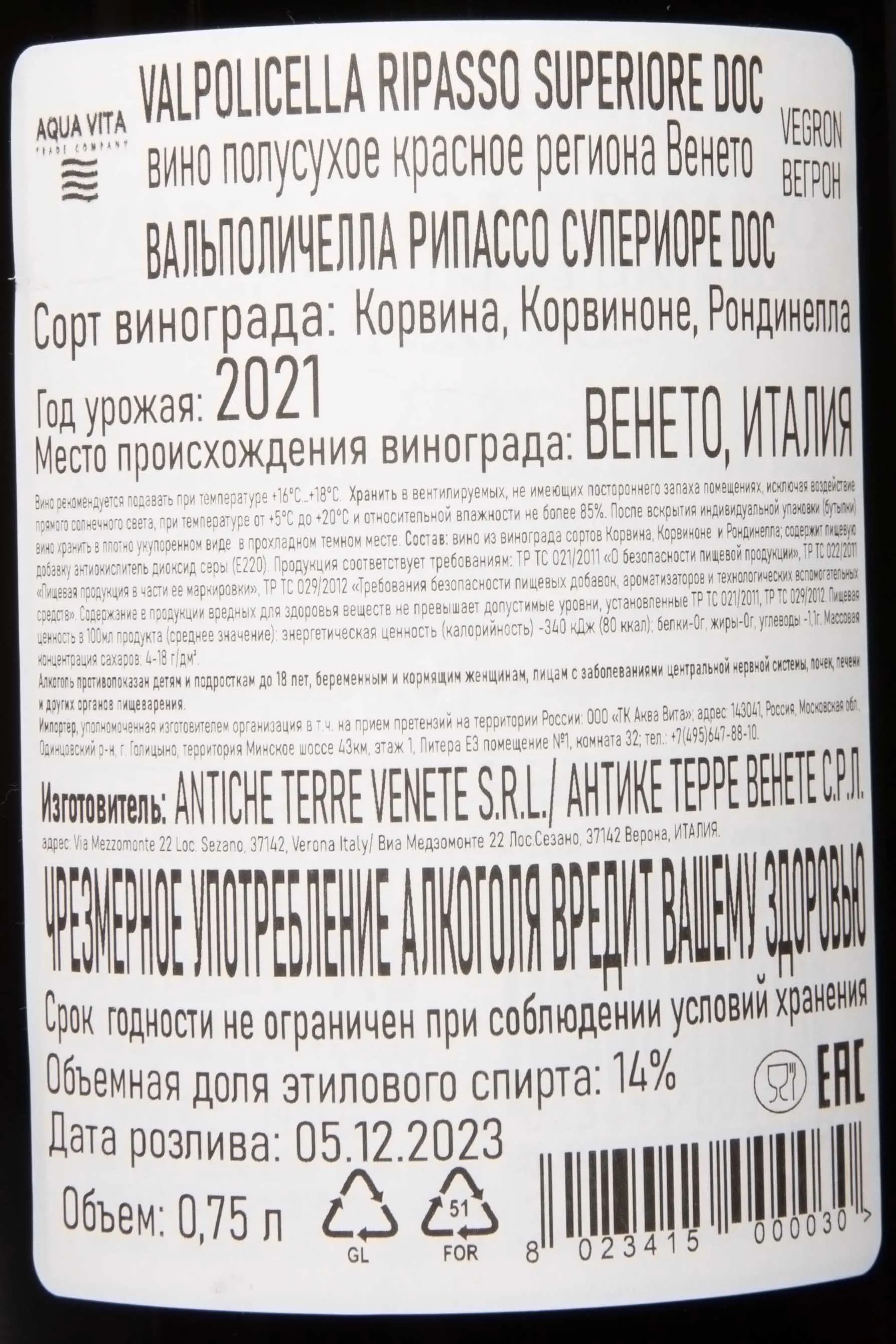 Вальполичелла Рипассо Супериоре Антике Терре Венете 2021 0.75