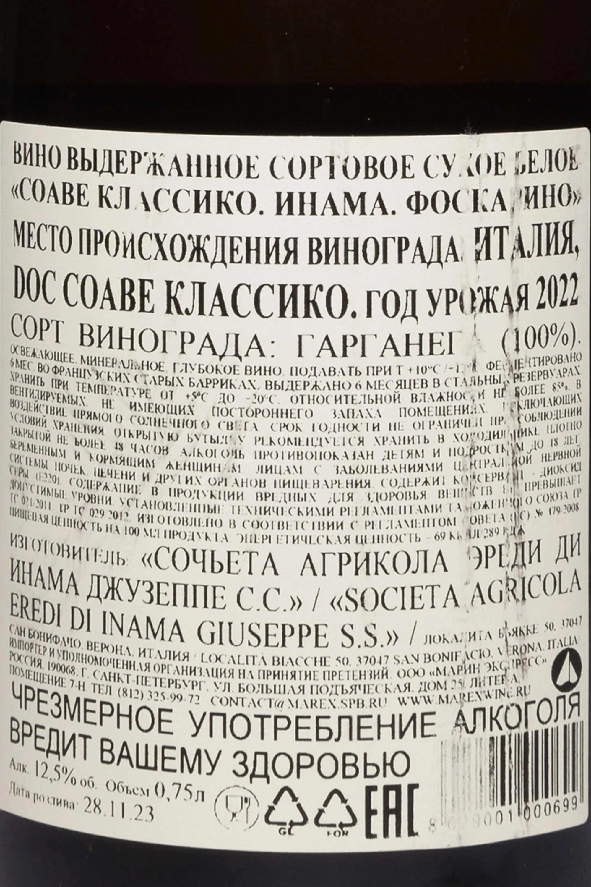 Белое сухое вино Inama Foscarino Soave Classico 2022 0.75 л создано из отборного урожая виноградников, расположенных на вулканических почвах холмов Фоскарино. Сбор плодов производили вручную в несколько этапов, строго контролируя зрелость каждой грозди. При изготовлении использовали традиционный метод бережного прессования, после чего сусло выдерживалось на тонком осадке в стальных ёмкостях и частично в дубовых бочках, что придало напитку особую глубину и утончённость. Завершением технологического процесса стала дополнительная выдержка в бутылке, обеспечившая гармоничность вкуса и аромата.