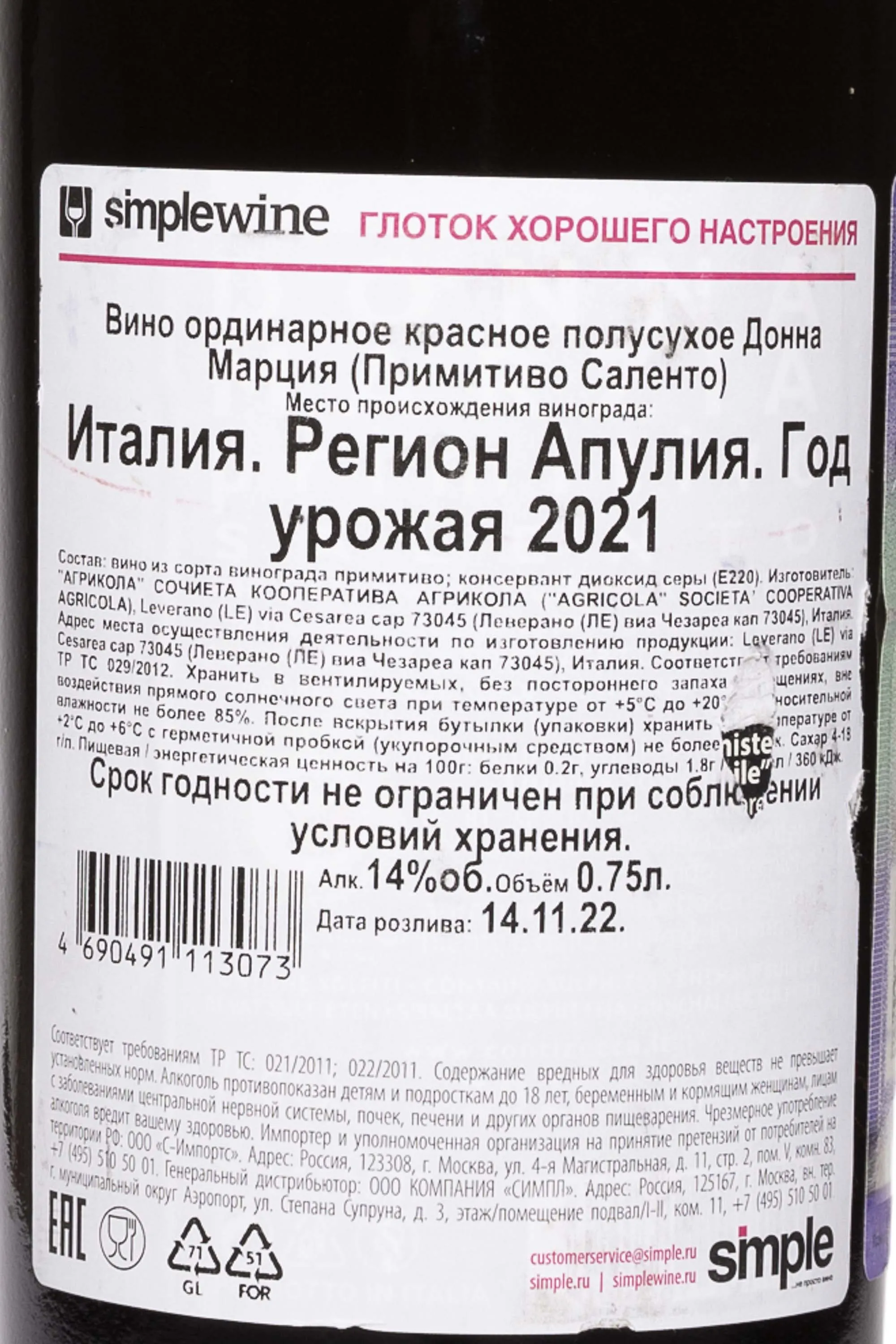 Красное полусухое вино Donna Marzia Primitivo Conti Zecca 0,75 л 2020 г. имеет среднюю сахаристость (от 4 до 18 г/л) и 14-градусную крепость. Его состав представлен одним виноградным сортом из региона Италии Апулии, который собрали в течение одного сезона с плантации площадью 40,5 га. Обработка включала этапы 12-суточной ферментации в стальных баках при поддерживаемой температуре 28-30 °C и вызревания сроком 12 месяцев в цементных емкостях. Согласно оценкам экспертов, это вино следует выпить на протяжении первых пяти лет после бутилирования (его провели осенью 2021 г.).