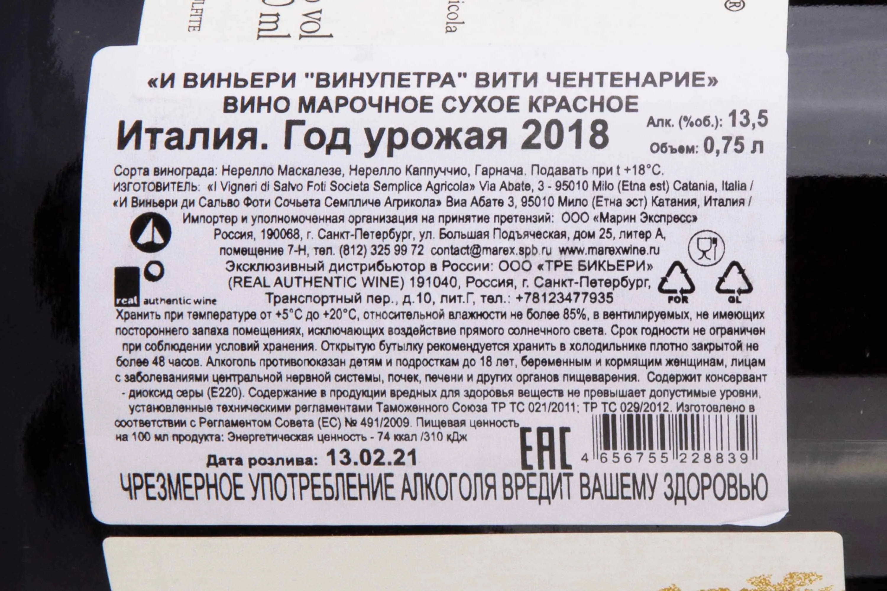 Vinupetra Viti Centenarie 2018 0.75 л купить - Итальянское вино Винупетра Вити Чентенарие цена в магазине г. Москва, ул. Профсоюзная, д. 16/10 10:00-22:00 Ежедневно +7 (495) 920-20-02 info@cru.ru