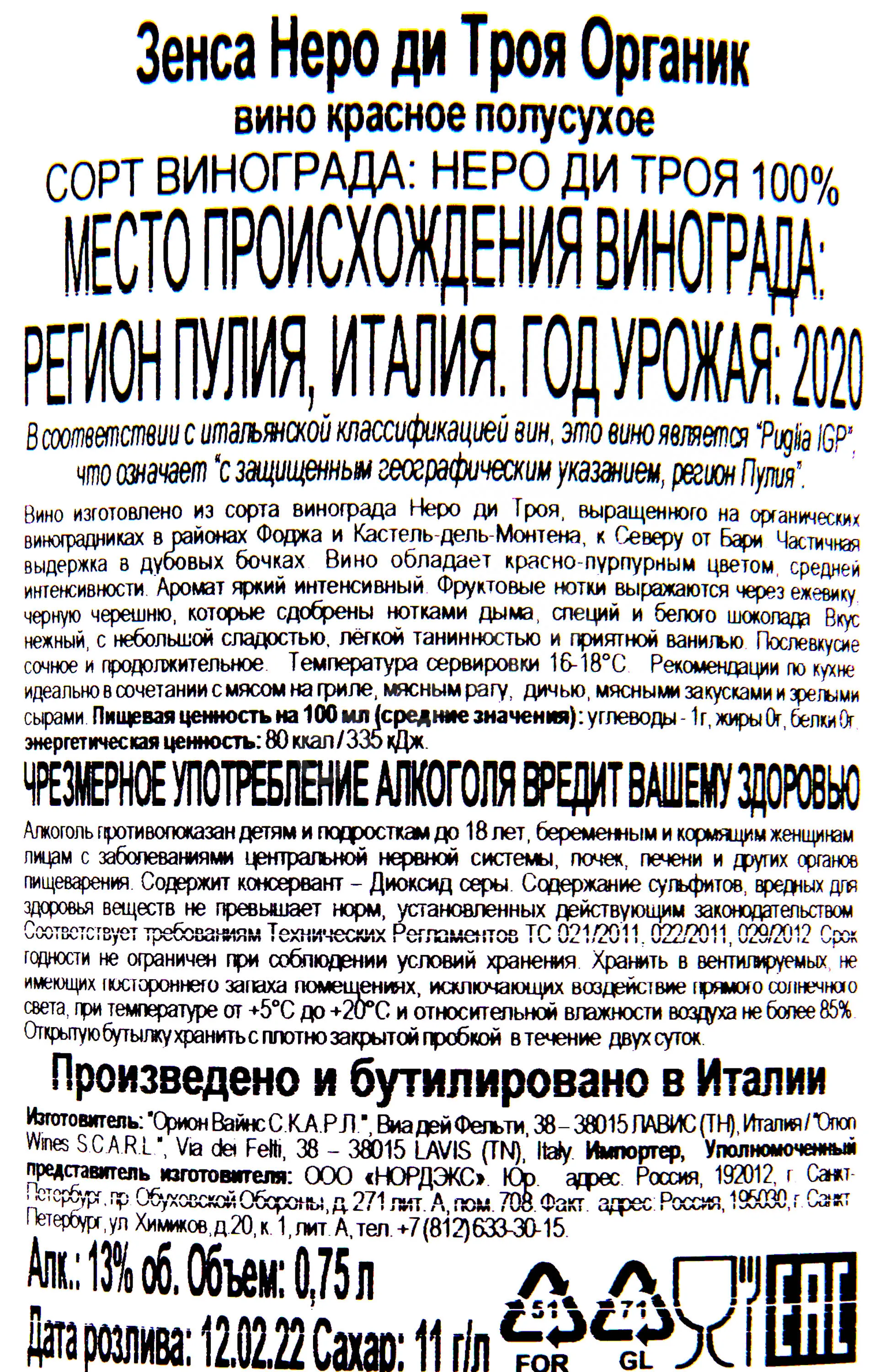 Зенса Неро ди Троя Органик 2020 0.75