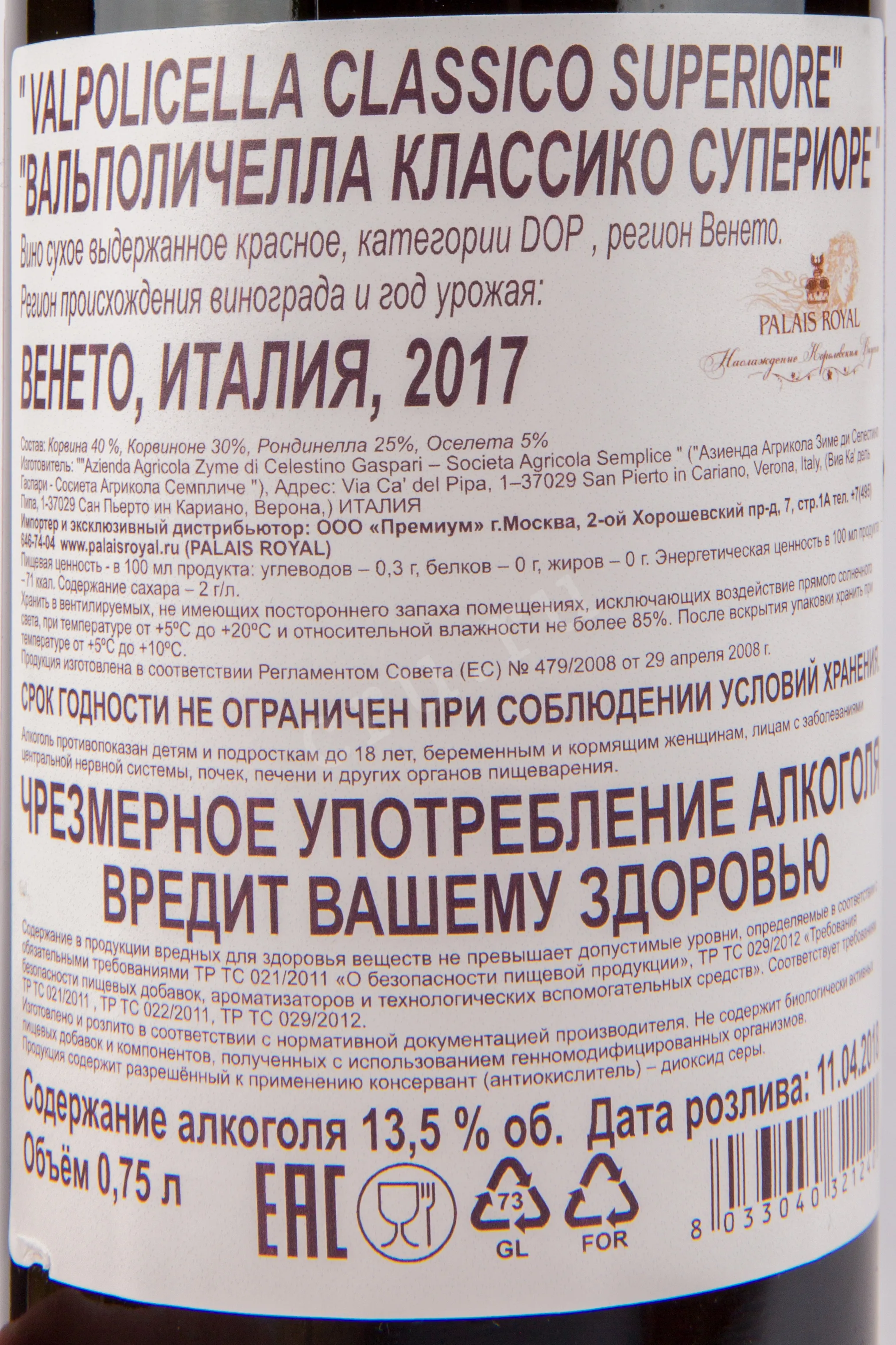 Вино Zyme Valpolicella Classico Superiore 2017 0.75 л создавалось из отборных ягод, собранных вручную в холмистой местности региона Вальполичелла. Урожай тщательно сортировали и подсушивали на специальных соломенных матах, благодаря чему концентрация аромата и вкуса ягод многократно усилилась. Особенностью технологии являлось длительное брожение в дубовых чанах с последующей продолжительной выдержкой в бочках из французского дуба. Благодаря богатству известковых и глинистых почв региона, напиток приобрел изысканный минеральный оттенок и особую глубину характера.