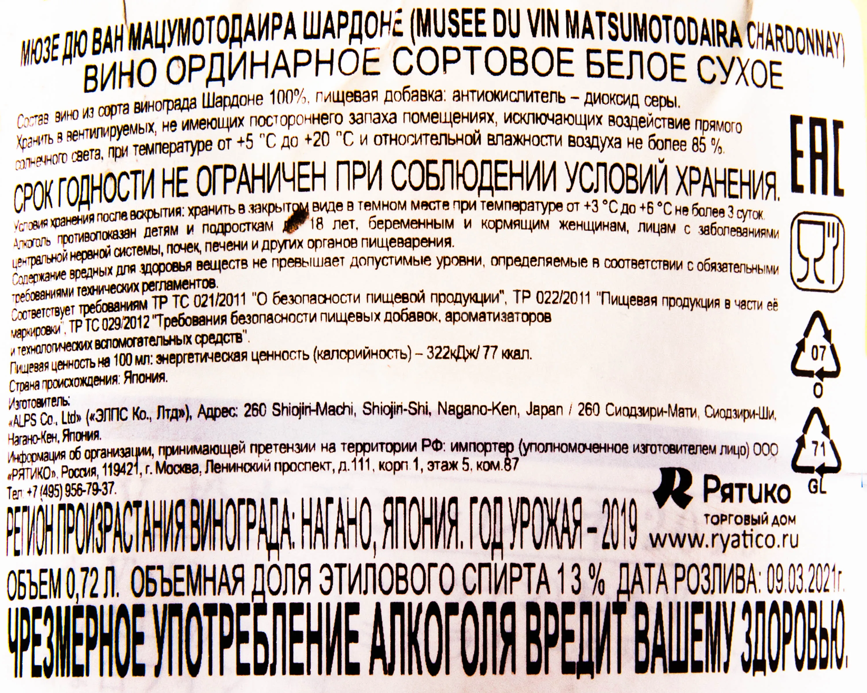 Musee du Vin Matsumotodaira Chardonnay 0.7 л купить - Японское вино Мюзе Дю Ван Мацумотодаира Шардоне цена в магазинег. Москва, ул. Профсоюзная, д. 16/1010:00-22:00 Ежедневно+7 (495) 920-20-02info@cru.ru