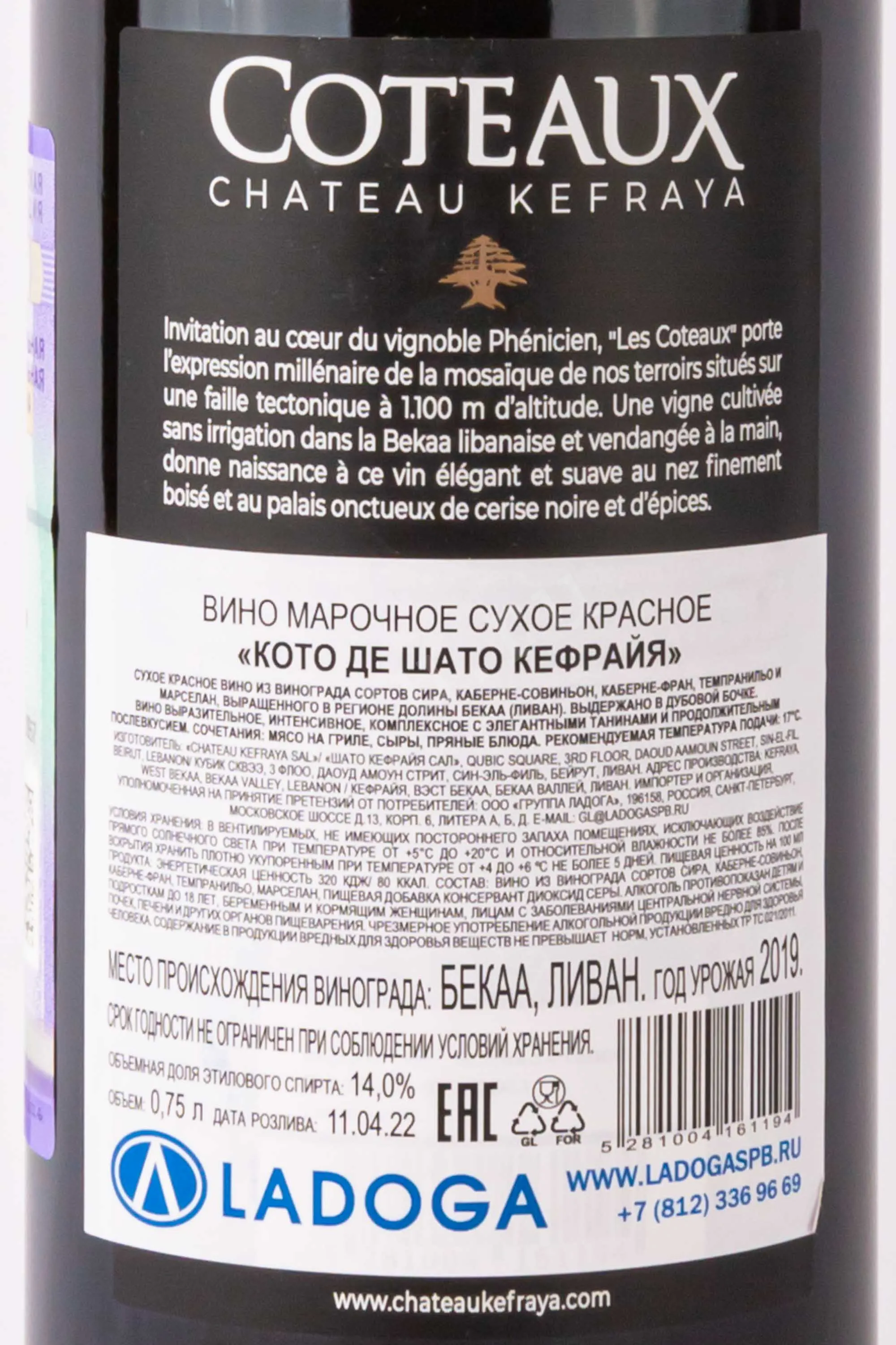 Красное сухое вино Chateau Kefraya Coteaux Rouge 2019 года 0,75 л — выразительное, комплексное, полнотелое. Производится в ливанском регионе долины Бекаа из 5 сортов, которые выращиваются на высоте около 1000 метров над уровнем моря. Благодаря особому микроклимату виноград здесь созревает медленно и равномерно, что обеспечивает высокое качество напитка. Урожай собирают вручную с тщательным отбором ягод. Ферментация проходит при контролируемой температуре в стальных резервуарах, после чего вино выдерживают больше года во французских дубовых бочках. Его уникальность заключается в сочетании местного терруара и классических французских технологий, что обеспечивает яркий характер, элегантность и сложность вкуса.