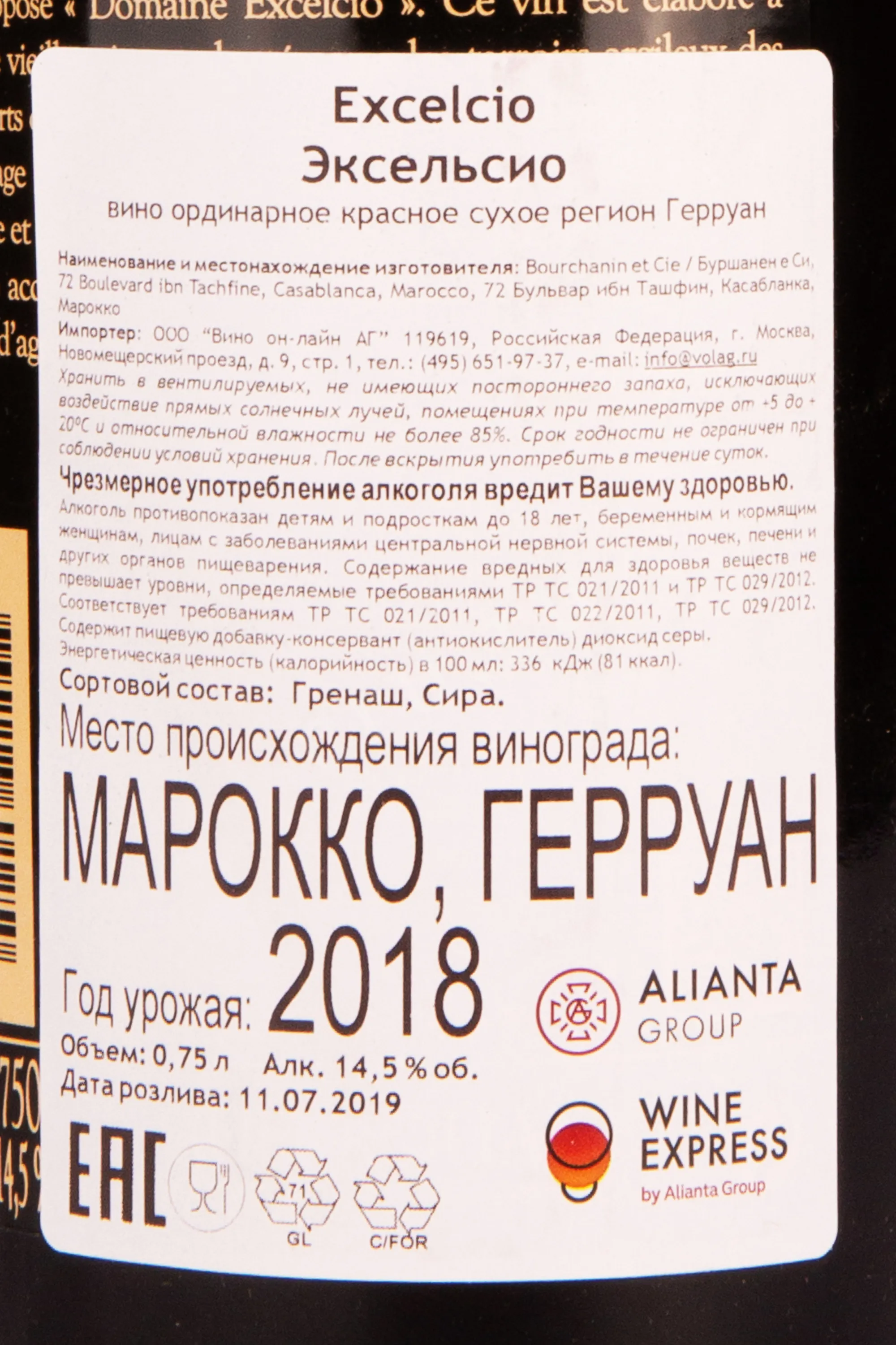 Красное сухое вино Bernard Magrez Domaine Excelcio Guerrouane AOG 2018 г. 0,75 л — представитель марокканского виноделия из региона Герруан в предгорьях Среднего Атласа, недалеко от города Мекнес. Терруар, расположенный на высоте 550 метров над уровнем моря, характеризуется глинисто-известняковыми почвами и умеренным климатом с континентальным и средиземноморским влияниям, создающим оптимальные условия для виноградарства. В 2018 году погодные условия были благоприятными: умеренные температуры и достаточное количество осадков способствовали равномерному созреванию ягод, что обеспечило высокое качество урожая. Ягоды сняли с лоз, возраст которых превысил 20 лет. Отсортированные плоды ферментировали на протяжении 2 недель в стальных резервуарах, после прессования последовал этап малолактики в новых бочках из французского дуба, а завершила винификацию выдержка – в таких же дубовых емкостях.