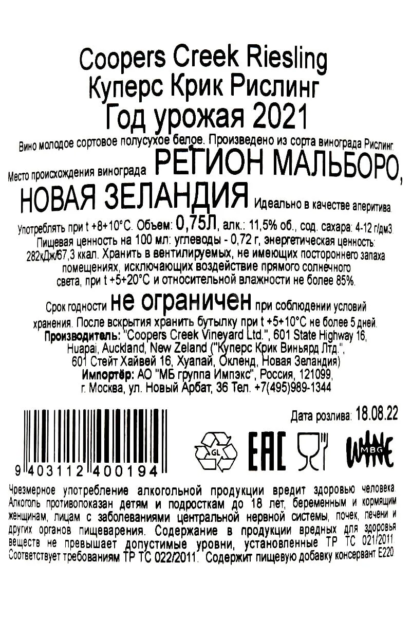 Куперс Крик Рислинг 2021 0.75