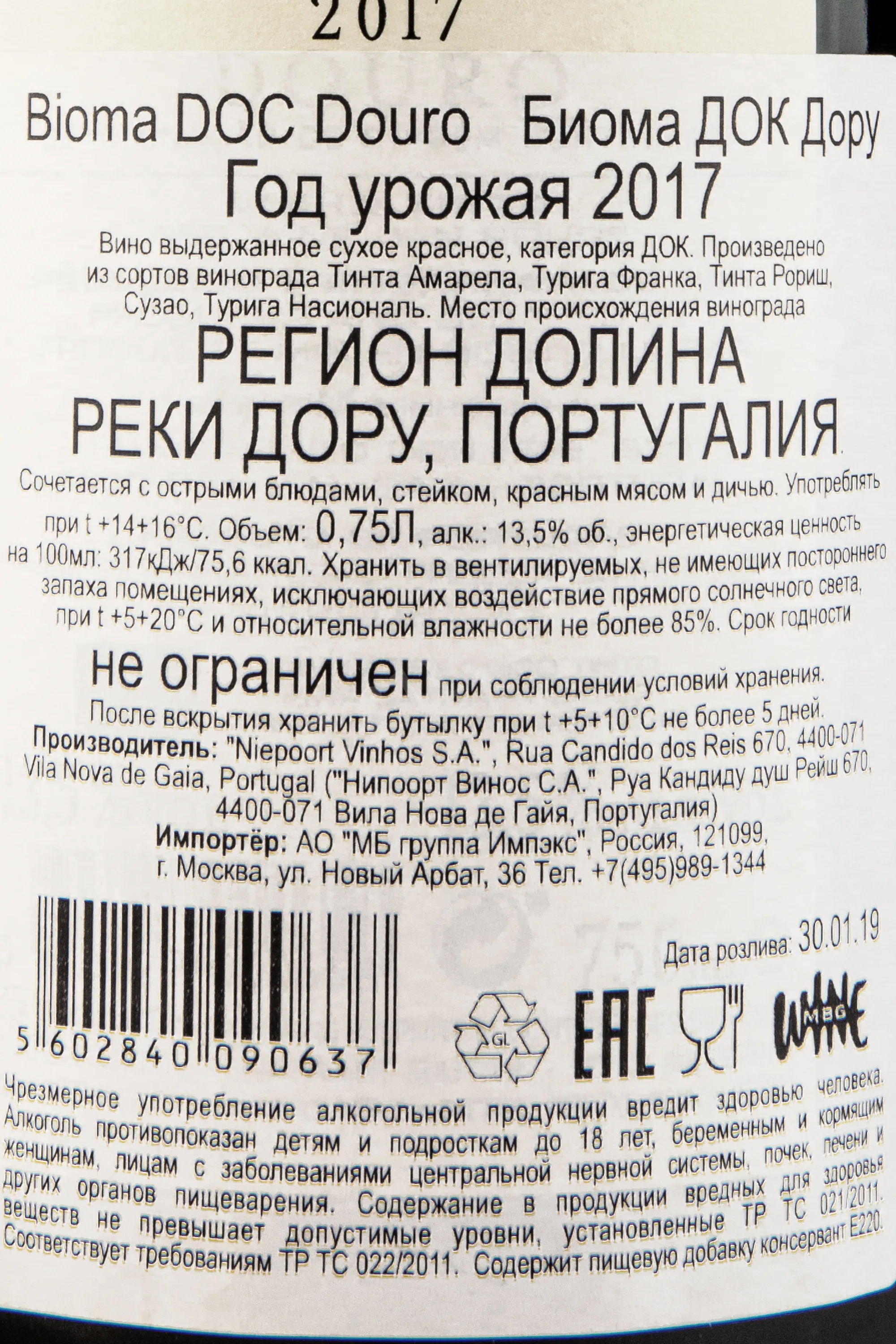 Bioma DOC Douro 0.75 л купить - Португальское вино Биома ДОК Дору цена в магазине г. Москва, ул. Профсоюзная, д. 16/10 10:00-22:00 Ежедневно +7 (495) 920-20-02 info@cru.ru