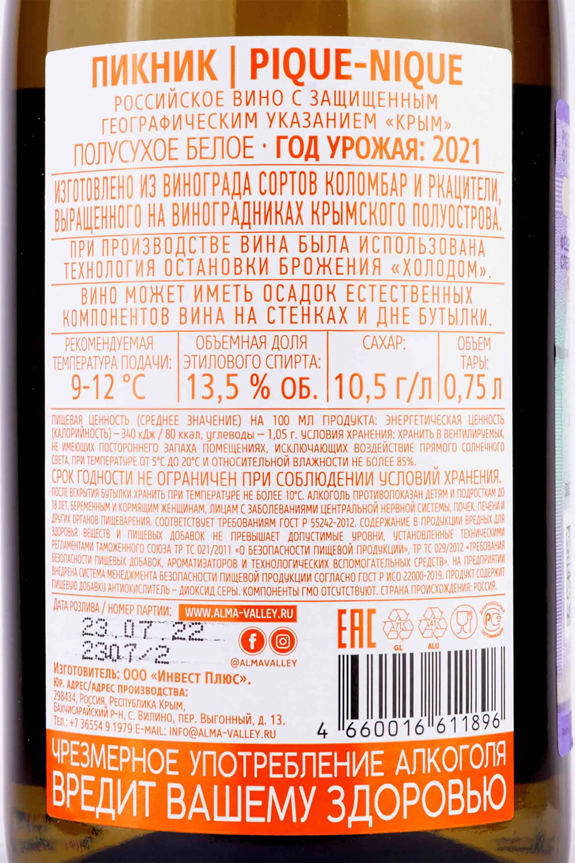 Вино белое полусухое Пик Ник Алма Вэлли 0,75 л — качественный напиток, созданный среди живописных холмов долины Альма в Крыму. Винодельня Алма Вэлли использует «гравитационный» метод производства: процесс созревания и розлива осуществляется без применения насосов, что позволяет сохранить естественную структуру и аромат винограда. Урожай сортов Коломбар и Ркацители собирают вручную на солнечных склонах, где почвы богаты известняком и мергелем, а мягкий морской климат способствует накоплению в ягодах минеральности и гармоничной кислотности. Для получения категории «полусухое» ферментация проходит при низких температурах, после чего кратковременное охлаждение останавливает процесс брожения, сохраняя в вине естественную сладость и легкость. Напиток отличается прозрачным светло-соломенным оттенком с нежным зеленоватым отливом и мягкой, маслянистой текстурой.
