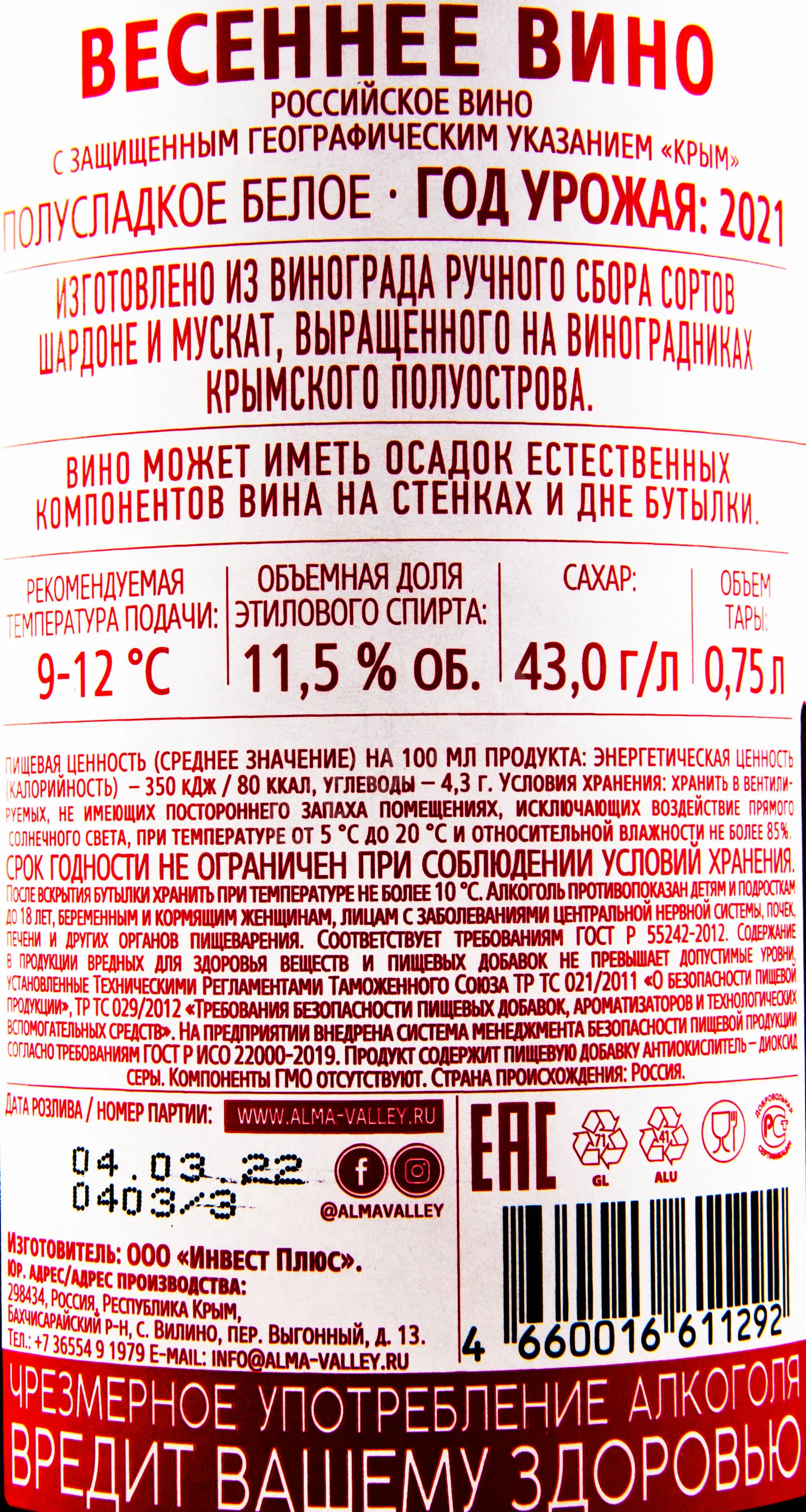 Вино белое полусладкое Алма Вэлли Весеннее 0,75 л — напиток с мягким характером и утончённой гармонией аромата и вкуса. Создан на винодельне Алма Вэлли, расположенной в живописном Бахчисарайском районе Крыма, где уникальный терруар с известняковыми почвами и мягким морским климатом придаёт ягодам особую выразительность. Производится по щадящей технологии: виноград Мускат Белый и Шардоне собирают вручную на рассвете, чтобы сохранить свежесть и аромат. После мягкого прессования сусло проходит холодную ферментацию в стальных резервуарах, что позволяет сохранить природные ноты цветков и спелых фруктов. Благодаря этому напиток приобретает сбалансированную сладость и изысканную структуру с лёгким, бархатистым послевкусием.