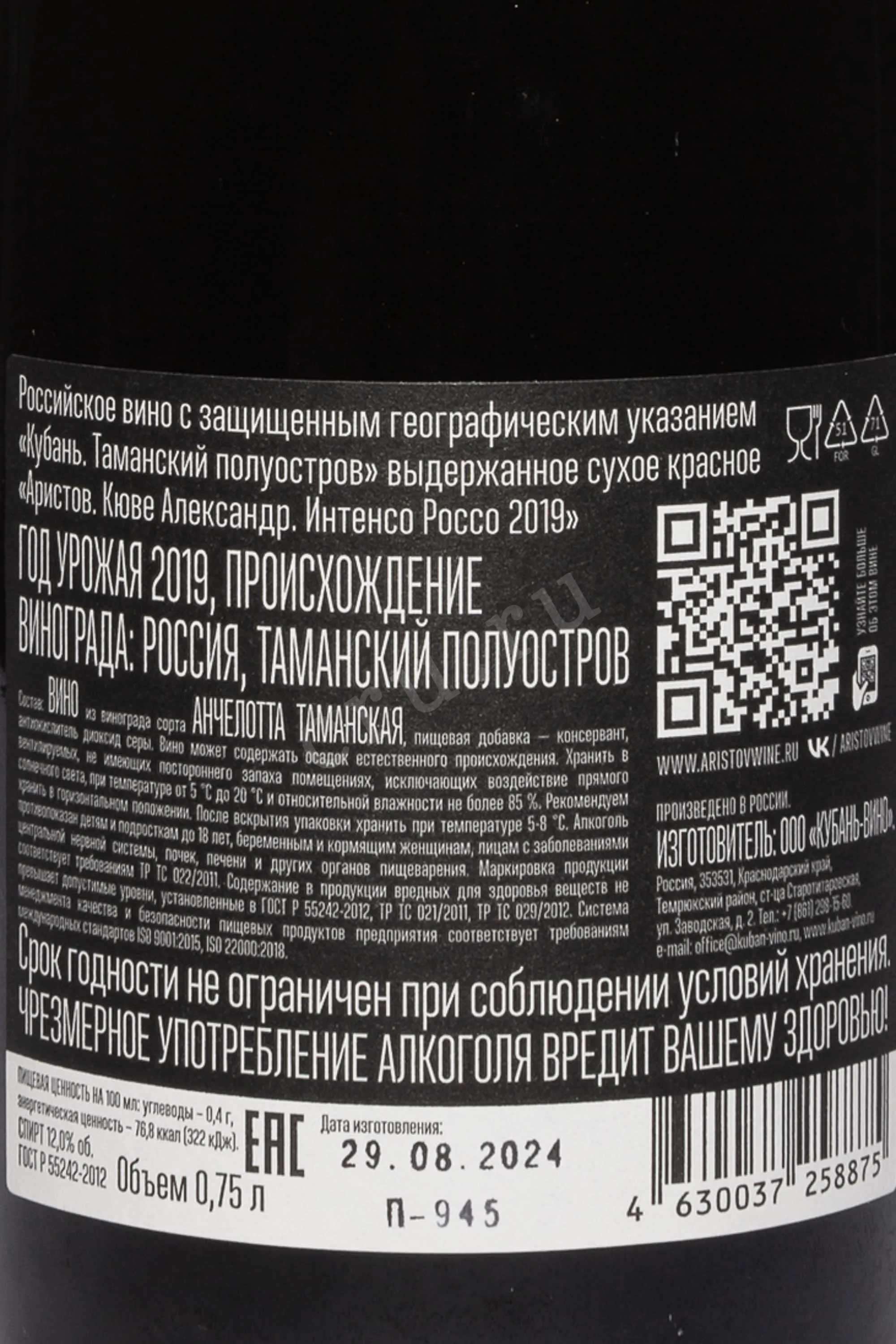 Красное сухое вино Аристов Кюве Александр Интенсо Россо 2019 года 0,75 л — насыщенное и выразительное, созданное из редкого сорта Анчелотта Таманская, выращенного на солнечных склонах Таманского полуострова. Почвы здесь богаты минералами, а климат мягкий и сухой, что позволило ягодам вызреть равномерно и набрать оптимальный уровень сахаров — 20–22%. Урожай 2019 года оказался особенно удачным: теплая весна и сухое лето обеспечили идеальные условия для зрелости винограда. Винифицировались целые грозди, без гребнеотделения. Ферментация протекала при контролируемой температуре до 25 °C с последующим яблочно-молочным брожением. После этого вино выдерживали 6 месяцев в стали и 30 месяцев в дубе, что придало напитку округлость и глубину. Интенсо Россо отличается богатым вкусом, шелковистой структурой и сложным ароматом, раскрывающимся с каждым глотком. Вино имеет потенциал для выдержки и с годами становится еще более многослойным.