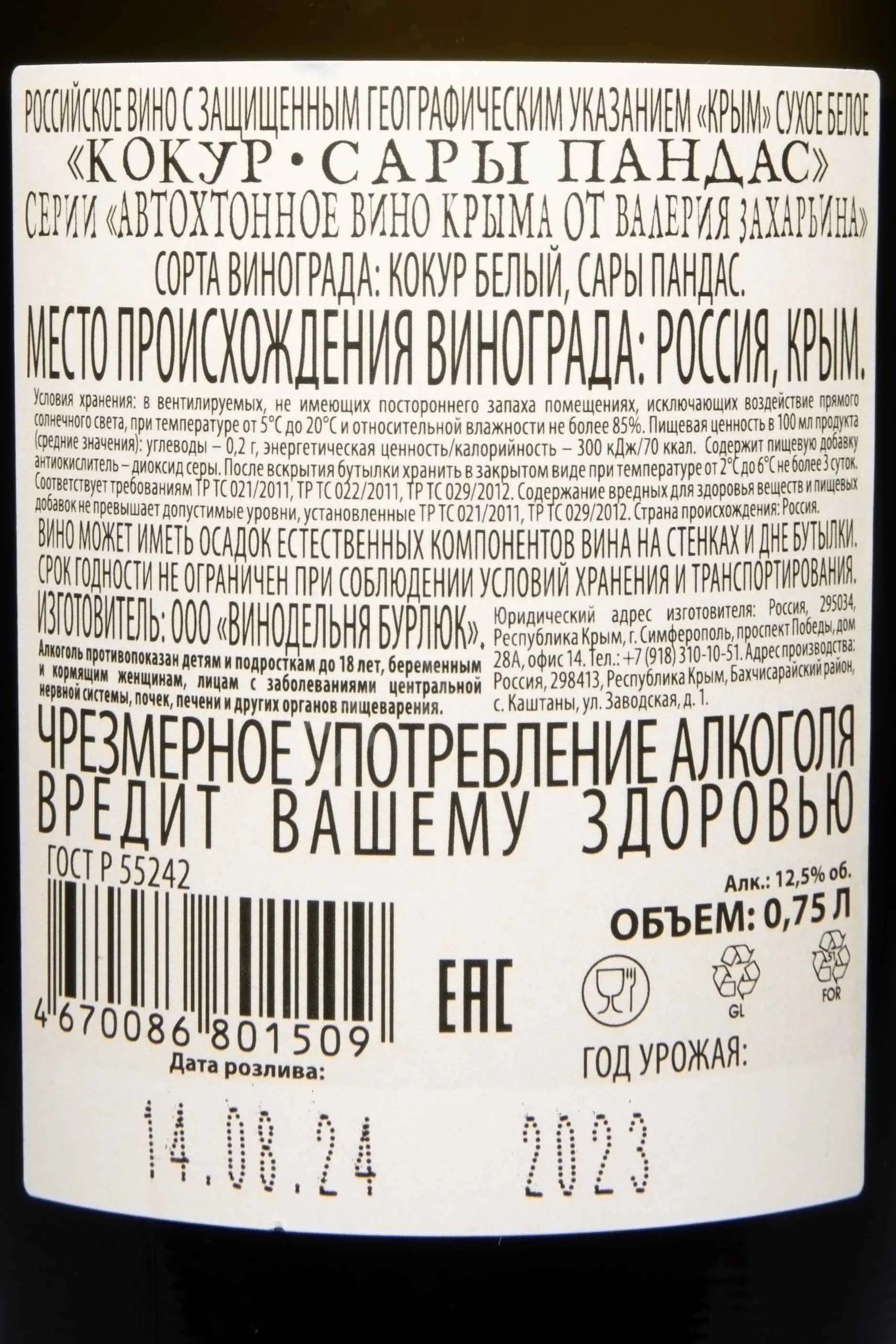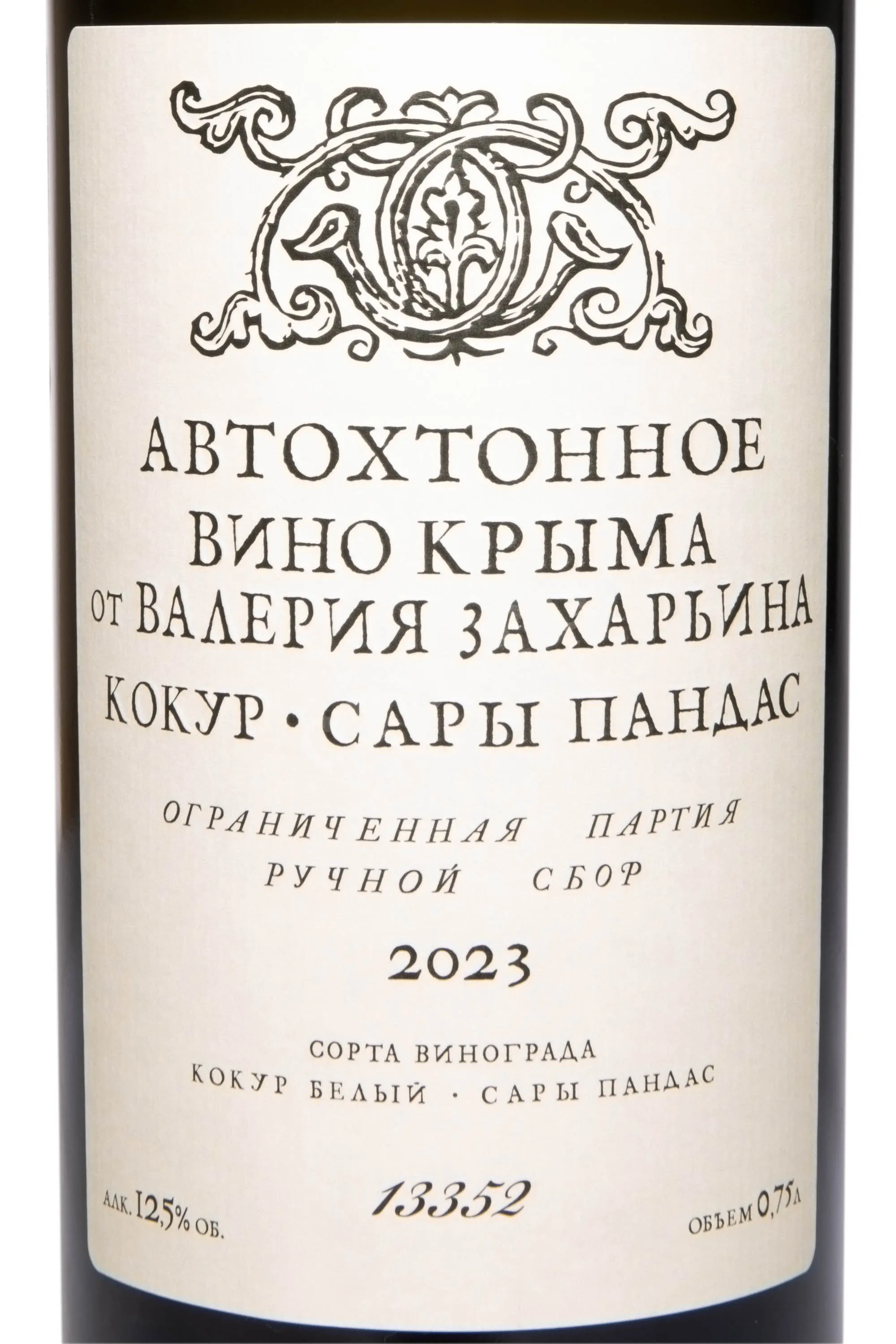 Автохтонное вино от Валерия Захарьина Кокур - Сары Пандас 0.75 л – белый сухой российский напиток, который был создан лучшими виноделами дома Валерия Захарьина. Производится он из отборного винограда, выращенного в Крыму. Урожай собирается вручную лишь после достижения определенной степени зрелости. Изготавливается специальным методом винификации в резервуарах из нержавеющей стали с особым контролем температуры.
