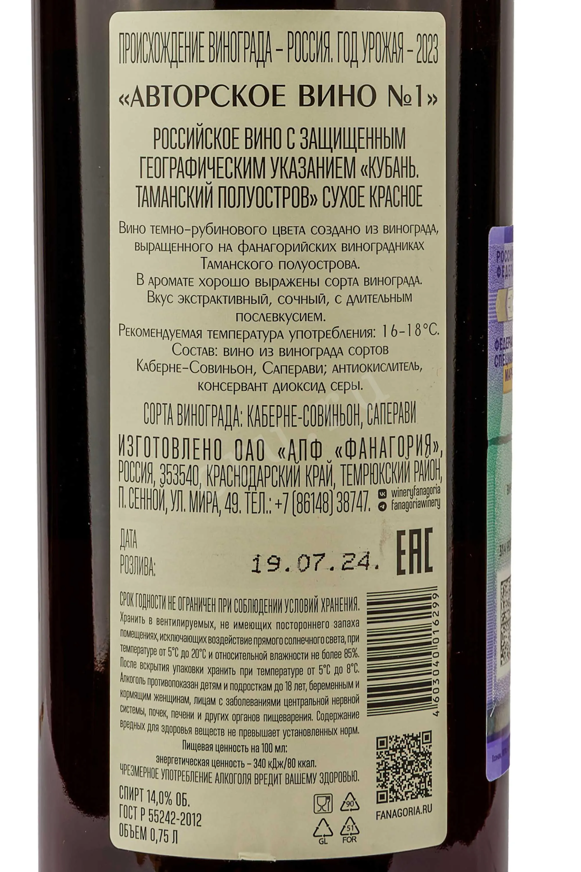 Вино Фанагория Авторское №1 красное сухое 2023 0.75 л
