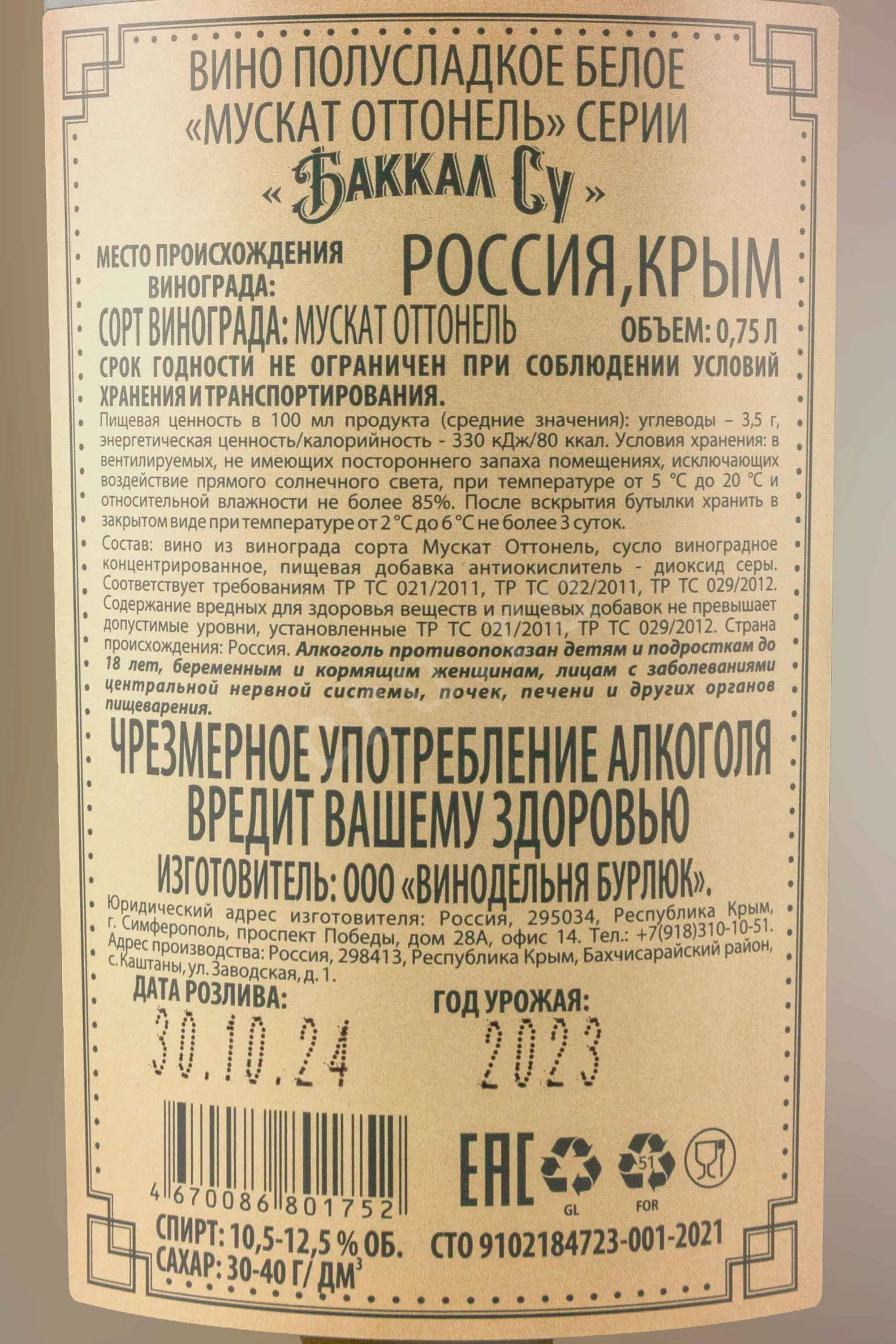 Вино Bakkal Su Muscat Ottonel 2023 0.75 l – это белый полусладкий алкоголь от российского производителя, изготовленный из сорта Мускат Оттонель урожая 2023 года. Виноград выращивается в западной части Крыма в долине реки Альма. Ягоды собирают ручным способом, чтобы сохранить их целостность. После транспортировки сырье сортируют и отжимают с помощью механического пресса. Полученное сусло сбраживают в стальных чанах при контролируемой температуре. После окончания ферментации вино проходит период отстаивания для естественной стабилизации и последующей фильтрации, что придает ему чистоту и прозрачность. Перед бутилированием напиток выдерживается в течение нескольких месяцев. Розлив осуществляется при крепости 12 градусов и уровне сахара 35 г/л.