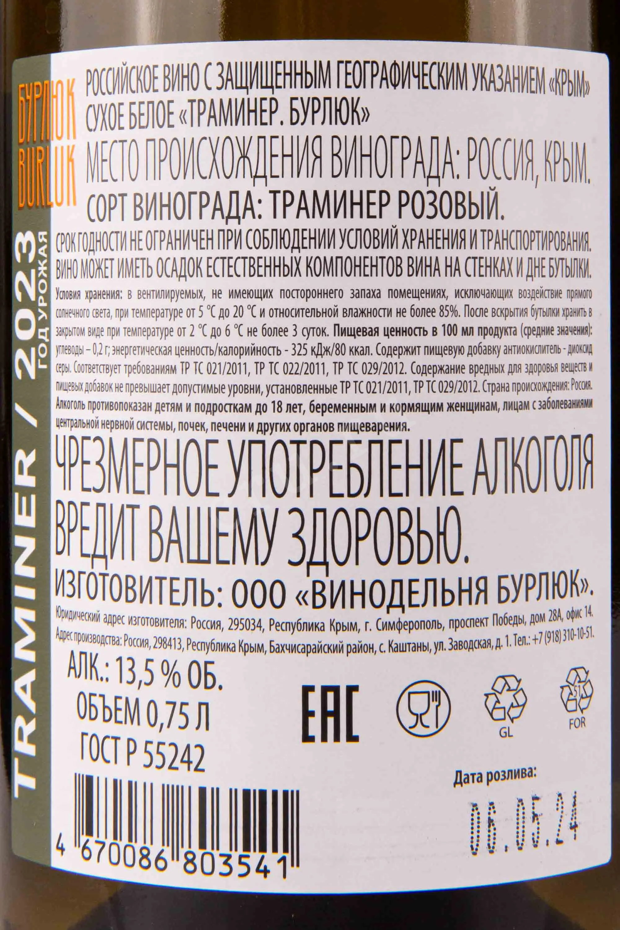 Изготовитель: ООО "Винодельня Бурлюк"