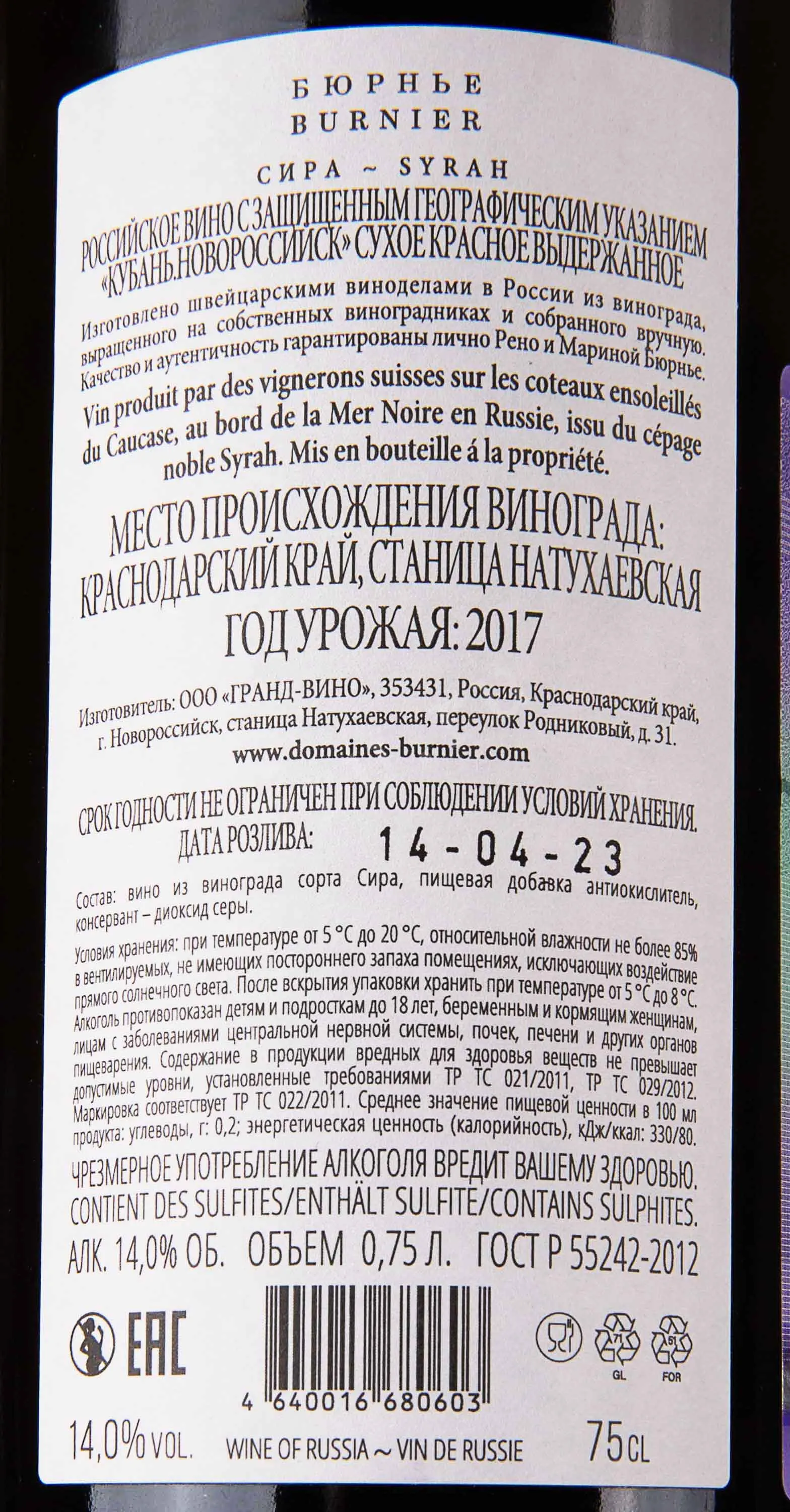 Вино Бюрнье Сира 0,75 л — это результат мастерства виноделов компании ООО «Гранд Вино», расположенной в солнечном Новороссийске. Производится красное сухое выдержанное спиртное из сорта Сира, выращенного на собственных участках, где виноград получает максимум тепла и морского бриза Черноморского побережья. После бережного сбора и мягкого отжима сусло проходит ферментацию при контролируемой температуре, что позволяет сохранить природную насыщенность и характер сорта. Выдержка длится не менее 36 месяцев в дубовых барриках, что придаёт напитку глубину, сложность и гармонию, а последующее дозревание в бутылке в течение 3 месяцев делает вкус особенно утончённым и благородным.