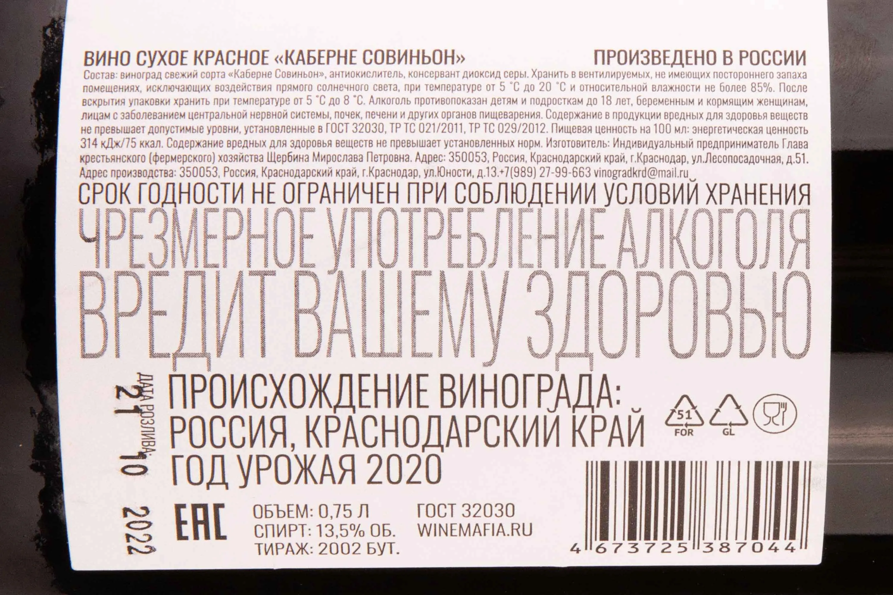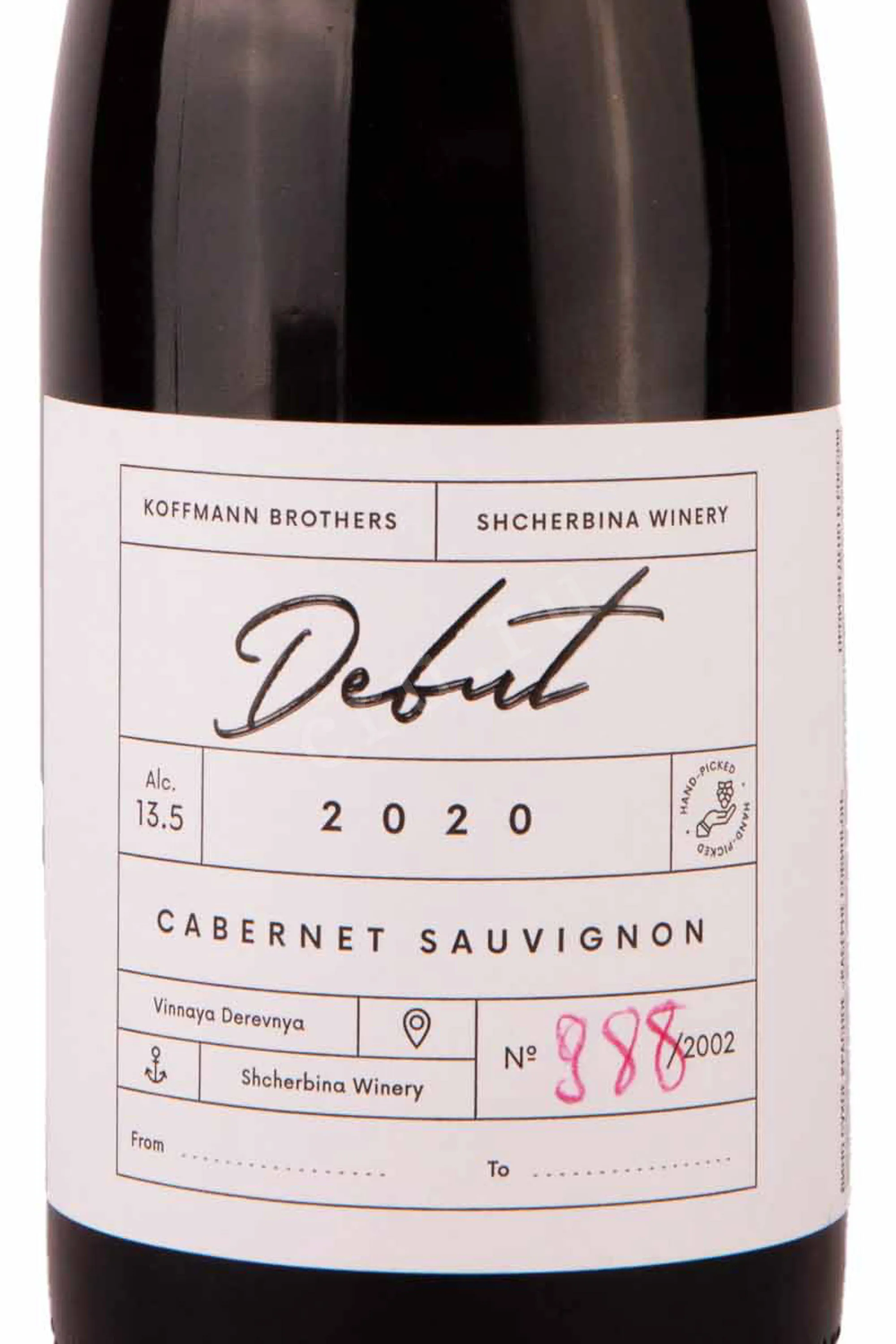 Красное сухое вино Scherbina Winery Koffman Brothers Cabernet Sauvignon Debut 2020 0.75 l представляет собой коллаборацию Koffman Brothers и Scherbina Winery. Напиток создан из одного сорта винограда урожая 2020 года. Ягоды были собраны ручным способом с лоз, средний возраст которых составляет 8 лет. После традиционной винификации напиток созревает в стальных резервуарах. Розлив был осуществлен в октябре 2022 года при крепости 13.5%. Тираж данного релиза составил 2002 бутылки.