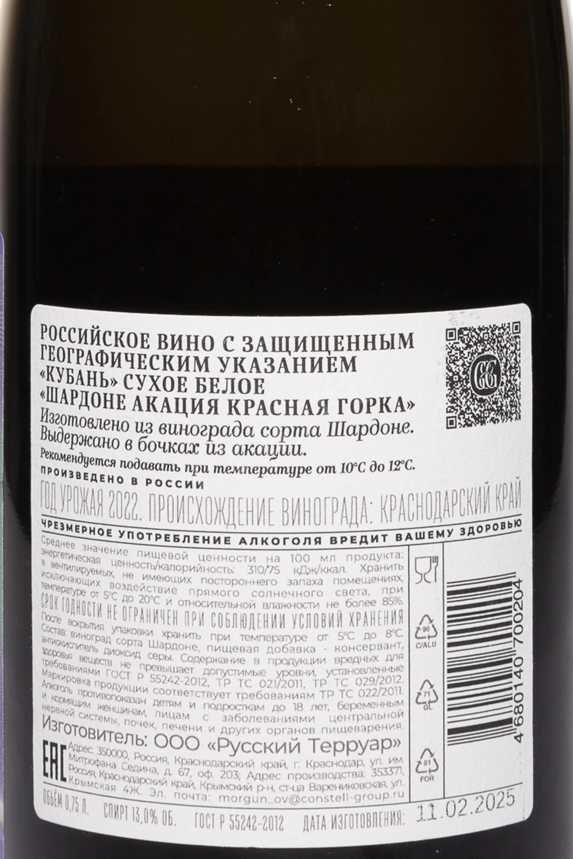 Белое сухое вино Галицкий и Галицкий Шардоне Акация Красная Горка 2022 года 0,75 л — элегантное, с чистым стилем и тонким балансом свежести и структуры. Оно создано из винограда сорта Шардоне, выращенного на виноградниках, расположенных в 30 км от Черного моря на высоте около 300 метров над уровнем моря. Умеренный морской климат с перепадом дневных и ночных температур способствовал равномерному созреванию ягод. Урожай 2022 года выдался удачным для региона: лето было теплым, без избыточных дождей, а осень — сухой и солнечной. Сбор винограда проводился вручную, после чего ягоды прошли тщательную сортировку и короткую криомацерацию для раскрытия аромата. Ферментация проходила в стальных емкостях (50%) и в бочках из венгерской акации (50%), что добавило напитку глубины и мягкости. Затем вино выдерживалось 15 месяцев на осадке в тех же пропорциях, сохранив природную яркость и минеральность. Оно отмечено знатоками за индивидуальный стиль и выразительный аромат с узнаваемым оттенком акации.