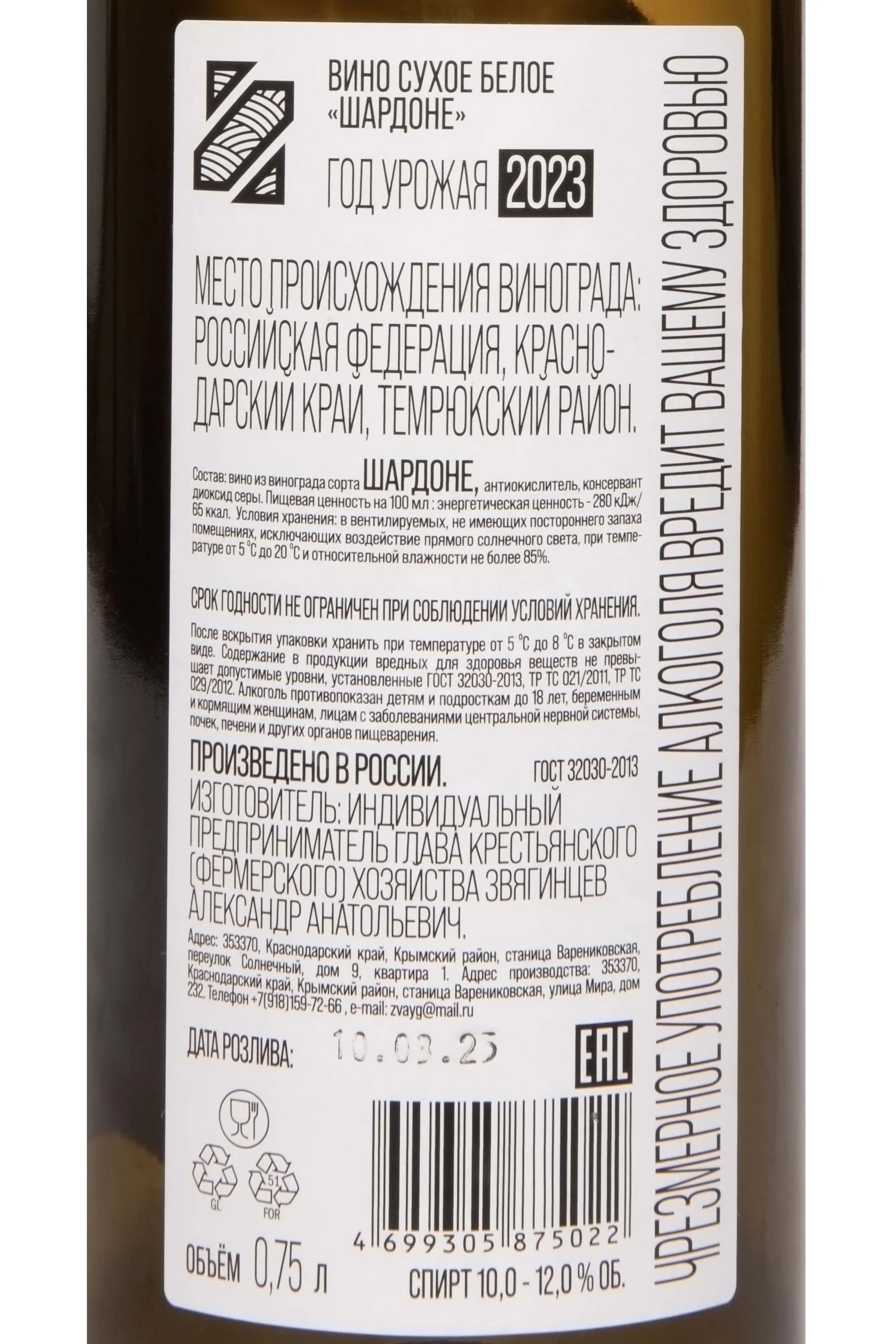 Звягинцев Шардоне 2023 0.75 л купить - Российское вино Zvyagintcev Chardonnay цена в магазине КРЮ ПРОФИ г. Москва, ул. Профсоюзная, д. 16/10 10:00-22:00 Ежедневно +7 (495) 920-20-02 info@cru.ru