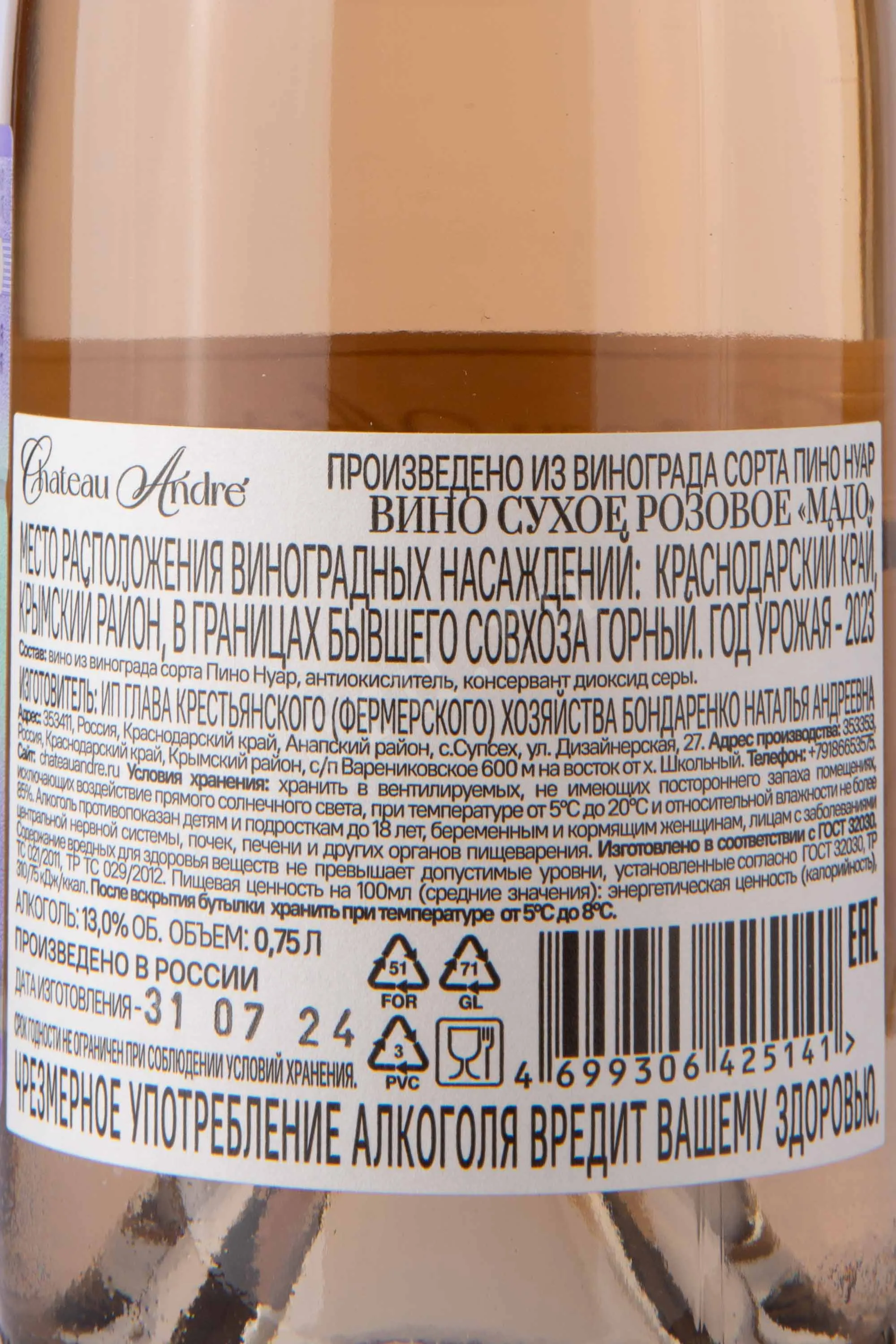 Вино Шато Андре Мадо 0,75 л — изящный образец современного российского виноделия, созданный в Краснодарском крае, в районе Крымска, где мягкий климат и солнечные склоны придают ягодам особую спелость и аромат. Винодельня Шато Андре объединяет традиции Франции и Германии: здесь культивируют и винифицируют виноград собственных хозяйств, используя щадящие методы ферментации и выдержки, чтобы сохранить природную свежесть и структуру вина. Для этого розового сухого напитка применяют красный сорт Шпетбургундер (Пино Нуар), выращенный на известково-глинистых почвах, которые придают спиртному тонкий баланс между кислотностью и мягкостью вкуса. Каждая стадия производства проходит под контролем энологов, а характерный оттенок и ароматный профиль формируются благодаря кратковременной мацерации сусла с кожицей ягод — методу, позволяющему добиться элегантного цвета и утончённого букета.