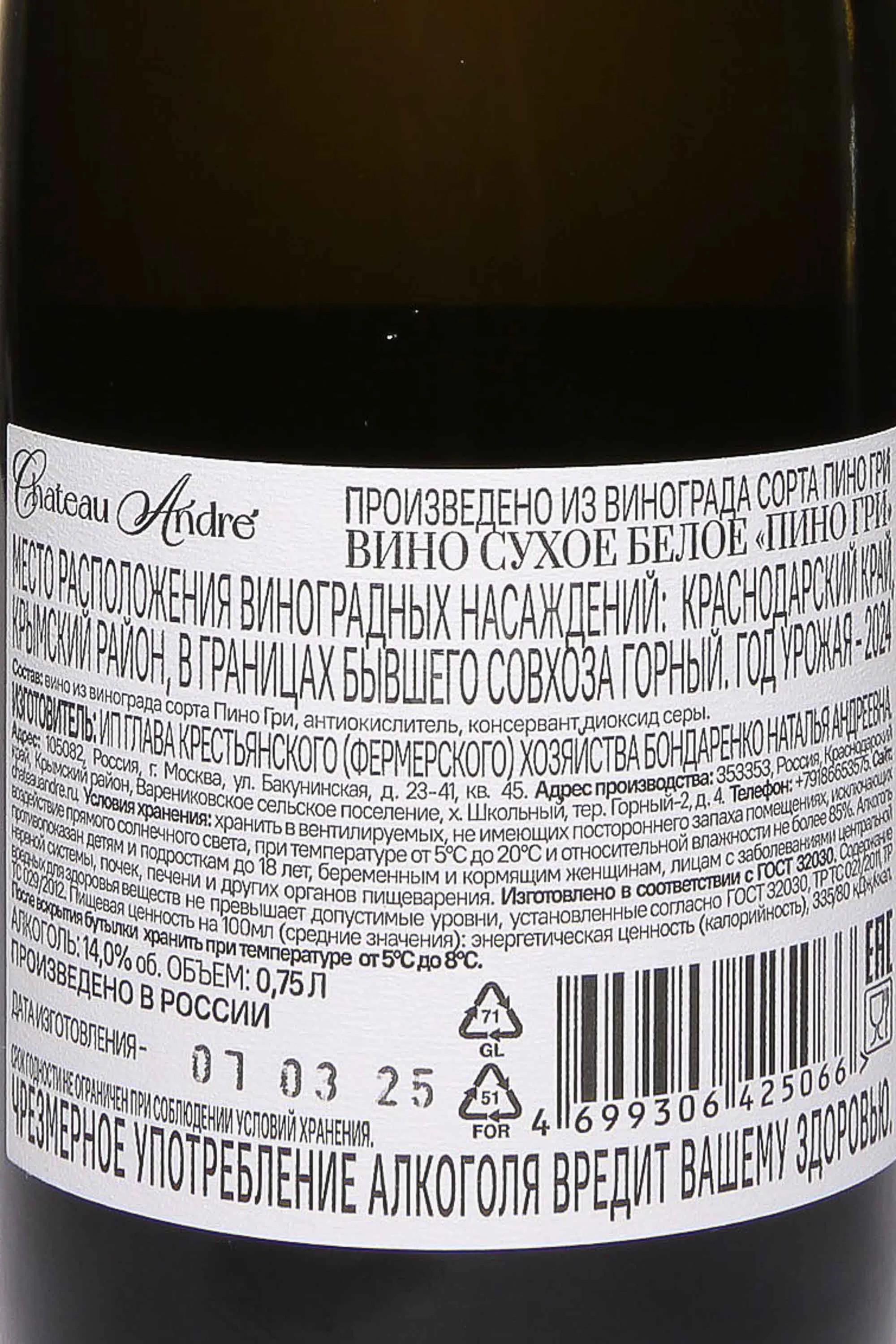 Белое сухое вино Шато Андре Пино Гри 2024 года 0,75 л создано в классическом европейском стиле из кубанского винограда. Он выращивается в Крымском районе Краснодарского края, на солнечных склонах. Теплые летние дни и прохладные ночи обеспечили гармоничное созревание ягод. 2024 год считается удачным: он отличался стабильной погодой, без резких перепадов температуры и продолжительных дождей. Ягоды достигли оптимального баланса сахара и кислотности. Ферментация проходила в стальных емкостях при контролируемой температуре, что позволило сохранить свежесть и фруктовый характер сорта. Выдержка была недолгой, направленной на подчеркивание природной чистоты вкуса. Вино отличается изящной структурой и уже успело получить положительные отзывы сомелье за свою сбалансированность и свежесть.