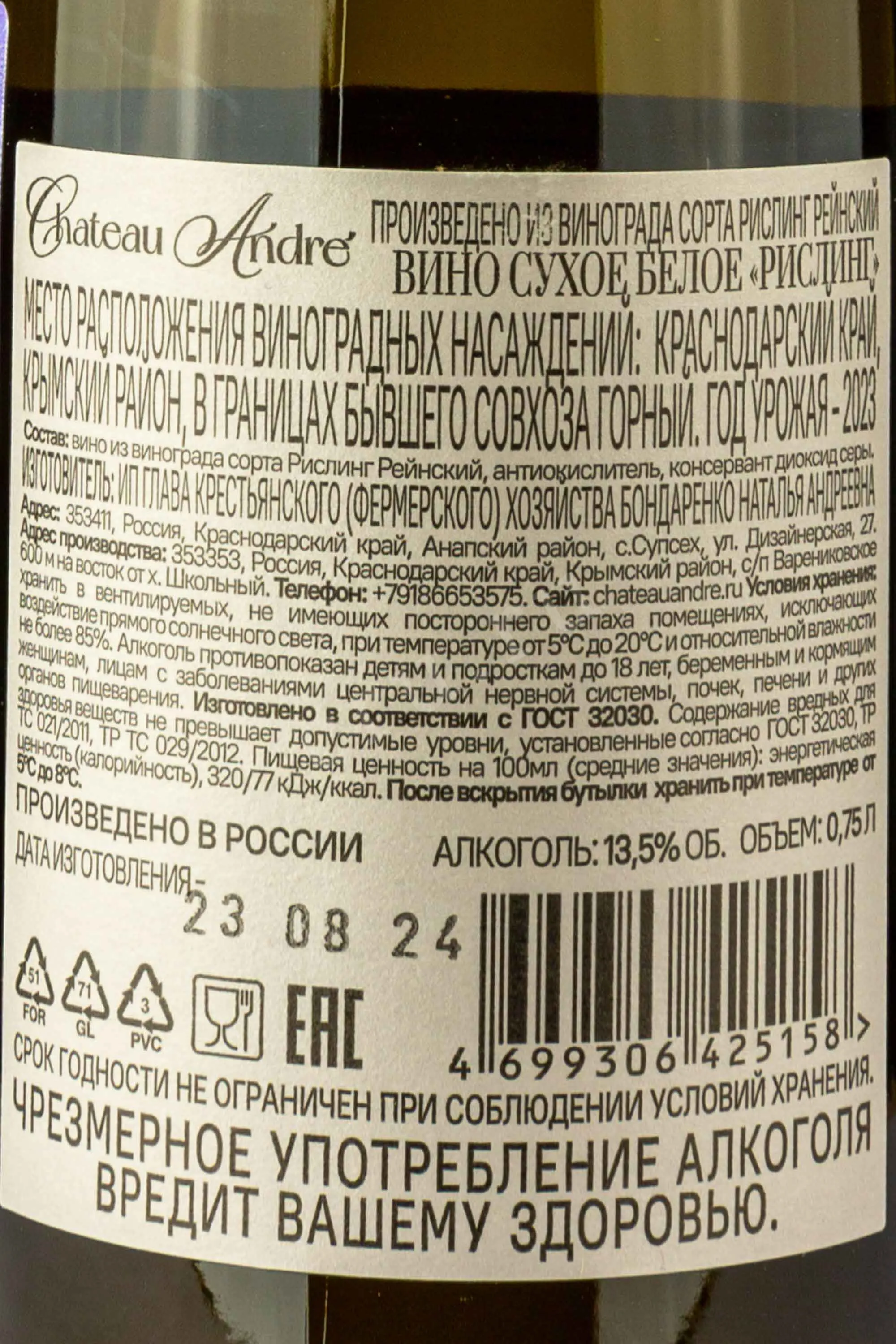 Вино Шато Андре Рислинг Белое сухое 0,75 л — изысканный напиток, созданный на винодельне «Шато Андре» под руководством основателя Н. Бондаренко. Производство основывается на классической технологии винификации с бережным прессованием и холодной ферментацией сусла, что позволяет сохранить природную свежесть и ароматическую чистоту сорта. Виноград выращивается на солнечных склонах с известняковыми почвами, которые придают напитку минеральные нюансы и гармоничную кислотность. Терруар региона — умеренно прохладный, с мягкими перепадами температур, благодаря чему ягоды созревают равномерно, наполняясь деликатными фруктовыми и цветочными тонами. Напиток отличается элегантным балансом между свежестью и глубиной, выражая характер региона и мастерство виноделов.