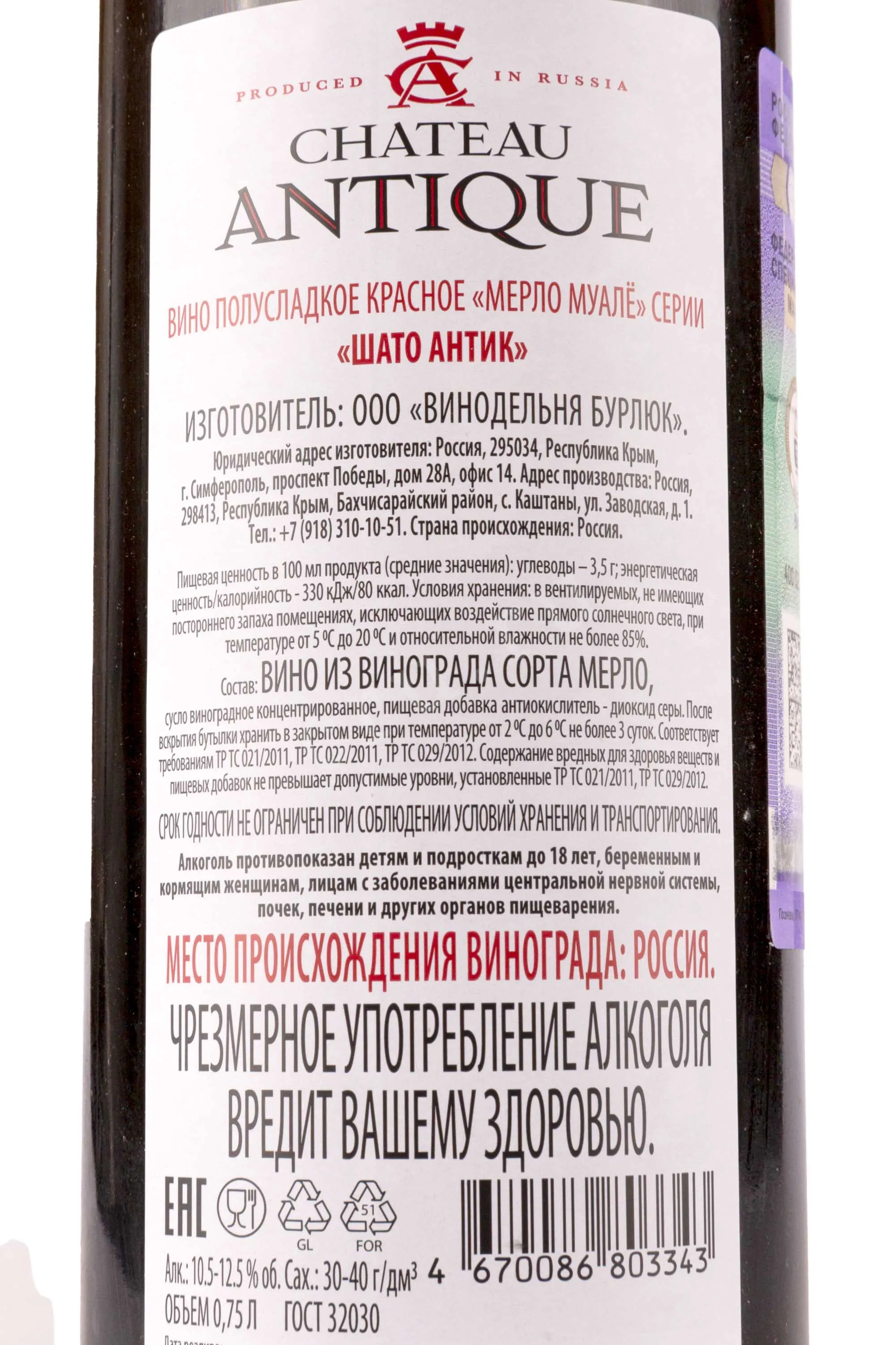 Вино Шато Антик Мерло муале 0,75 л — высококлассный напиток, созданный на винодельне «Бурлюк», расположенной в живописных предгорьях Бахчисарайского района Крыма. Здесь, на солнечных склонах с известняковыми почвами, виноград сорта Мерло получает максимум тепла и минерального питания, что придаёт вину бархатистость и выразительность. Урожай собирают вручную в хозяйстве В. Захарьина — опытные виноделы бережно следят за степенью зрелости ягод. Мягкая мацерация и контролируемое брожение при невысокой температуре позволяют сохранить естественную сладость и ароматическую насыщенность напитка. После кратковременного выдерживания он приобретает гармоничный баланс между фруктовой свежестью и тонкой пряностью, характерной для крымских вин.