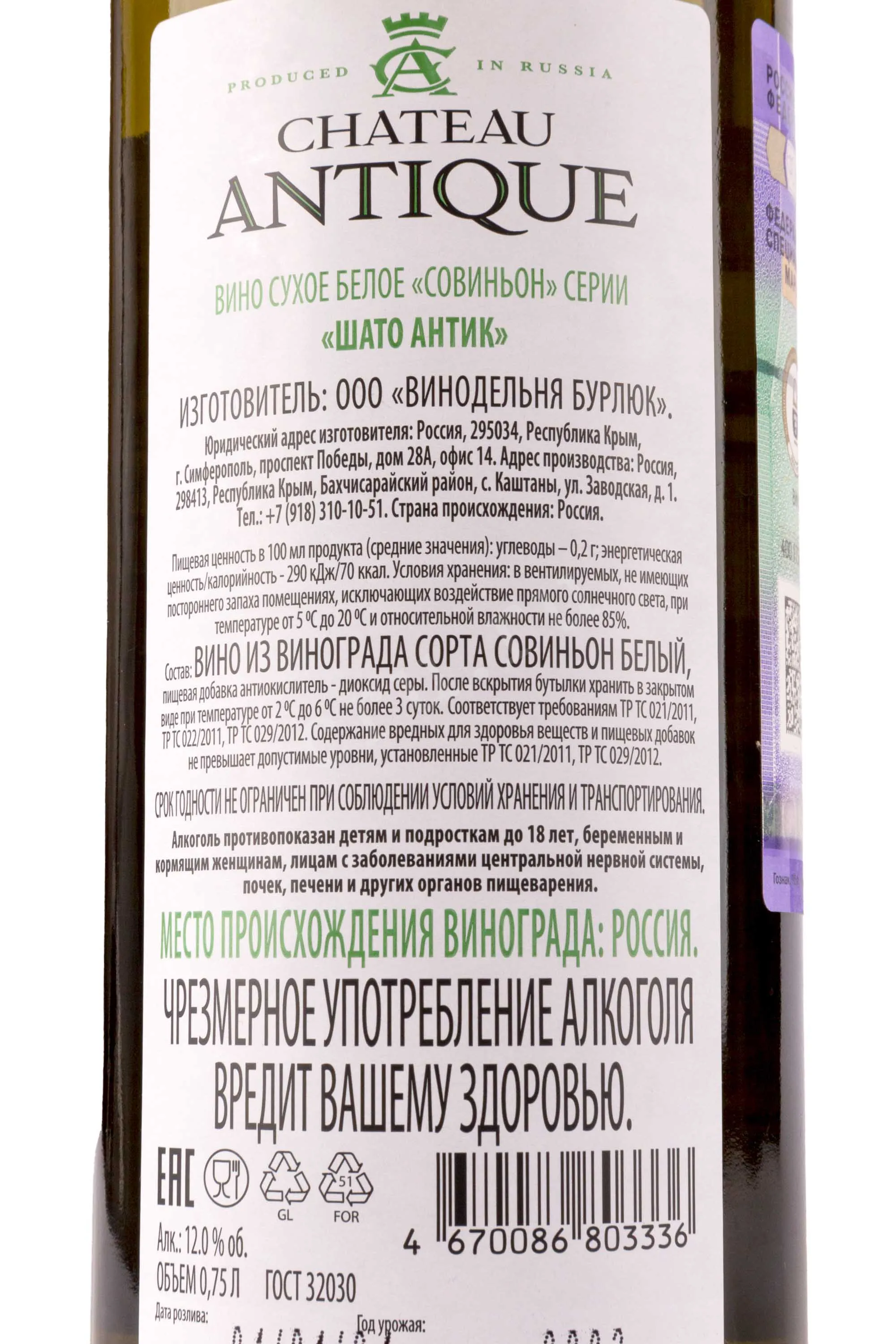 Вино шато Антик Совиньон 0,75 л — качественное белое сухое спиртное от крымских виноделов, воплощающее многолетние традиции и природное богатство полуострова. Производство, основанное в 1932 году и входящее в ГК «Валерий Звхарьин», объединяет классическую технологию и современное оборудование. Виноград сорта Совиньон Блан собирают вручную на солнечных склонах с известковыми и песчано-глинистыми почвами Южного берега Крыма. Терруар с морским бризом и горным воздухом придаёт напитку свежесть и минеральную утончённость. Брожение проводится при контролируемой температуре в стальных емкостях, что позволяет сохранить природную ароматику и тонкий вкус ягод. В результате рождается элегантный напиток с выразительным характером и гармоничным послевкусием.