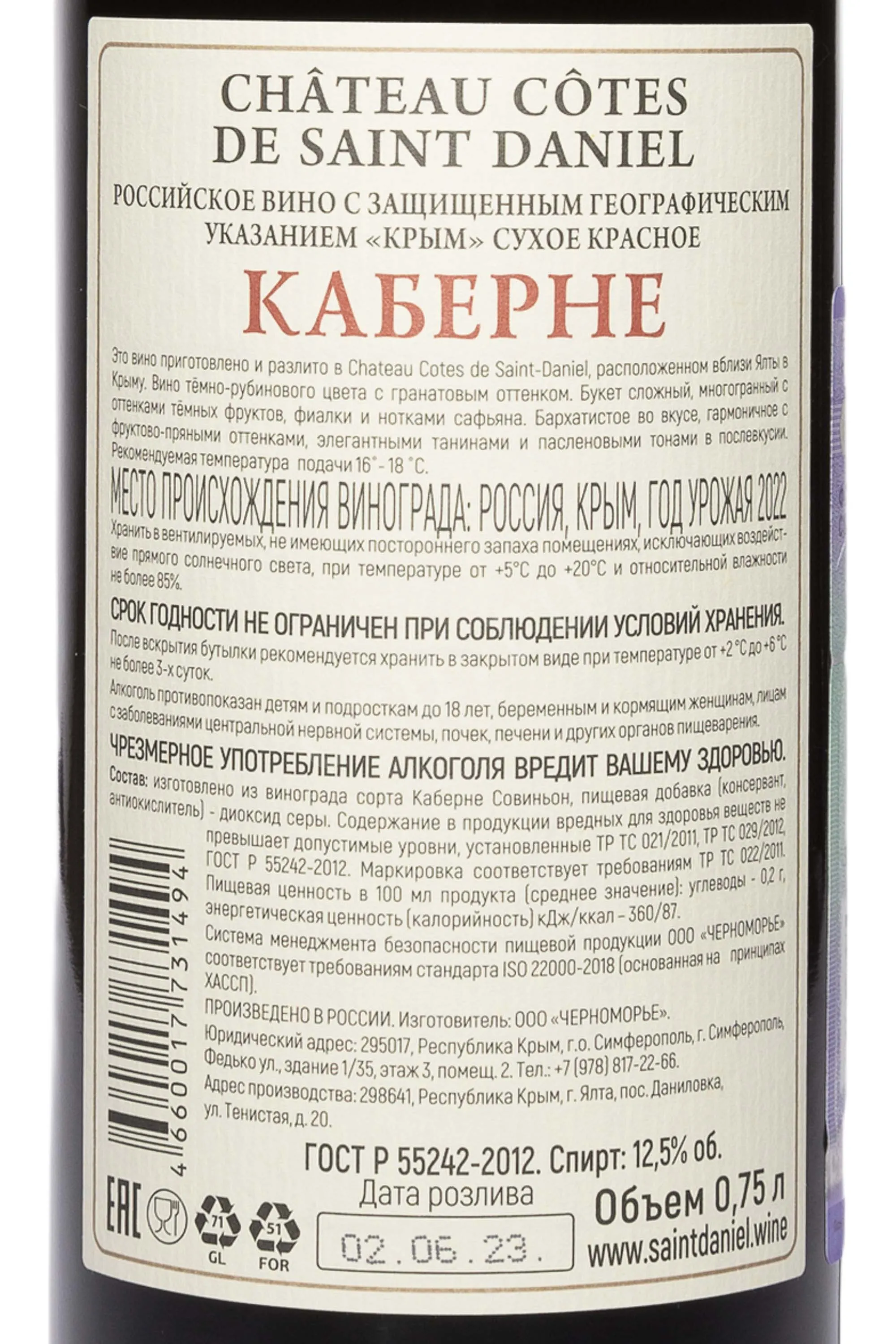 Красное сухое вино Chateau Cotes de Saint Daniel Каберне 2022 года 0,75 л создано в классическом средиземноморском стиле с крымским характером. Виноград Каберне Совиньон выращен на солнечных склонах у Ялты, где мягкий климат и морские бризы помогают ягодам равномерно созревать и сохранять свежесть. 2022 год выдался тёплым и сухим, что позволило получить концентрированные, ароматные ягоды с идеальным балансом сахара и кислотности. Сбор урожая проводили вручную в сентябре. Проводилась предварительная мацерация при повышенной температуре, что придало вину насыщенный цвет и выраженные фруктовые тона. Брожение проходило естественным образом, с постепенным снижением температуры, а затем вино сняли с осадка и отправили на выдержку в емкости из нержавеющей стали на 5 месяцев. Такой подход обеспечил чистоту вкуса и свежесть букета. Это российское Каберне ценится за элегантность и гладкую структуру, отмечается экспертами за баланс и яркость ароматики.