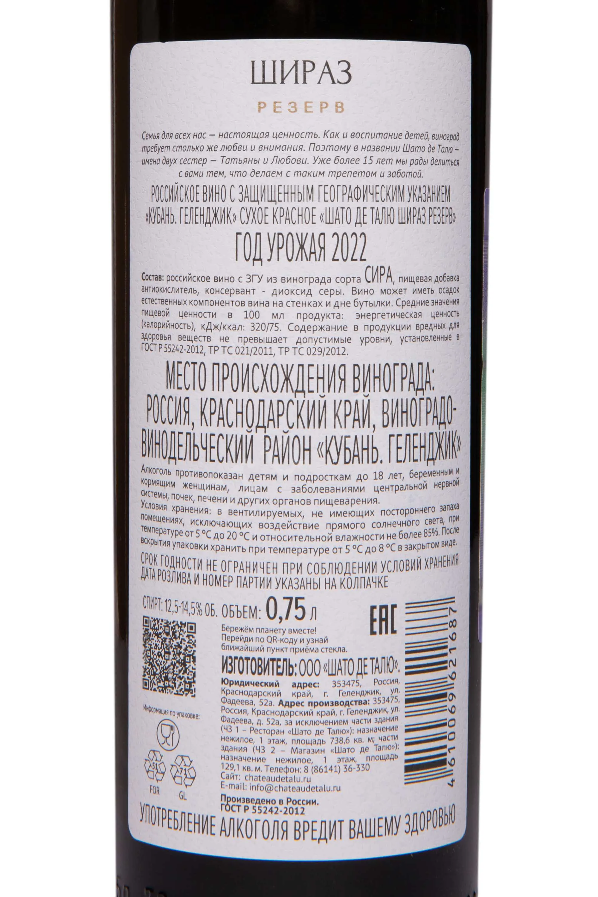 Красное сухое вино Шато де Талю Шираз Резерв 2022 г. 0,75 л создано на виноградниках Тамани, где тёплый климат, яркое солнце и морские бризы сформировали условия для равномерного созревания сорта. Почвы песчано-известнякового состава позволяют ягодам набрать плотность и насыщенный сок. Миллезим отличался стабильными погодными условиями, что позволило собрать виноград при оптимальной зрелости. Винификацию проводили с применением гравитационных методов при контролируемой температуре, сохраняя природную глубину ароматов сырья. Затем напиток выдержали в дубе 22 месяца и ещё полгода — в бутылках.