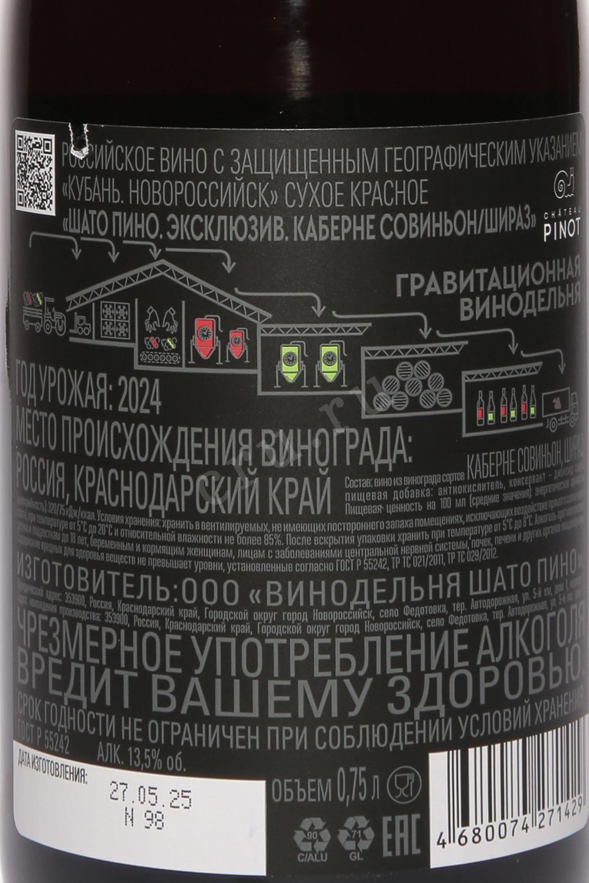 Вино Шато Пино Эксклюзив Каберне Совиньон Шираз 2023 0.75 л — изысканный купаж, рожденный в самом сердце южных виноградников Краснодарского края. Напиток создан из тщательно отобранных ягод, собранных вручную в утренние часы, когда они сохраняют максимум свежести и аромата. В процессе производства используется метод холодной мацерации, позволяющий бережно извлечь насыщенный цвет и комплексный букет. Брожение проходит в нержавеющих чанах при контролируемой температуре, а последующее выдерживание в дубовых бочках придает напитку округлость и глубокие бархатные ноты. Терруар региона славится сочетанием солнечного климата, черноземных почв и лёгких бризов с побережья, благодаря чему ягоды набирают оптимальный баланс сахара и кислотности, формируя выразительный характер и многослойность вкуса.