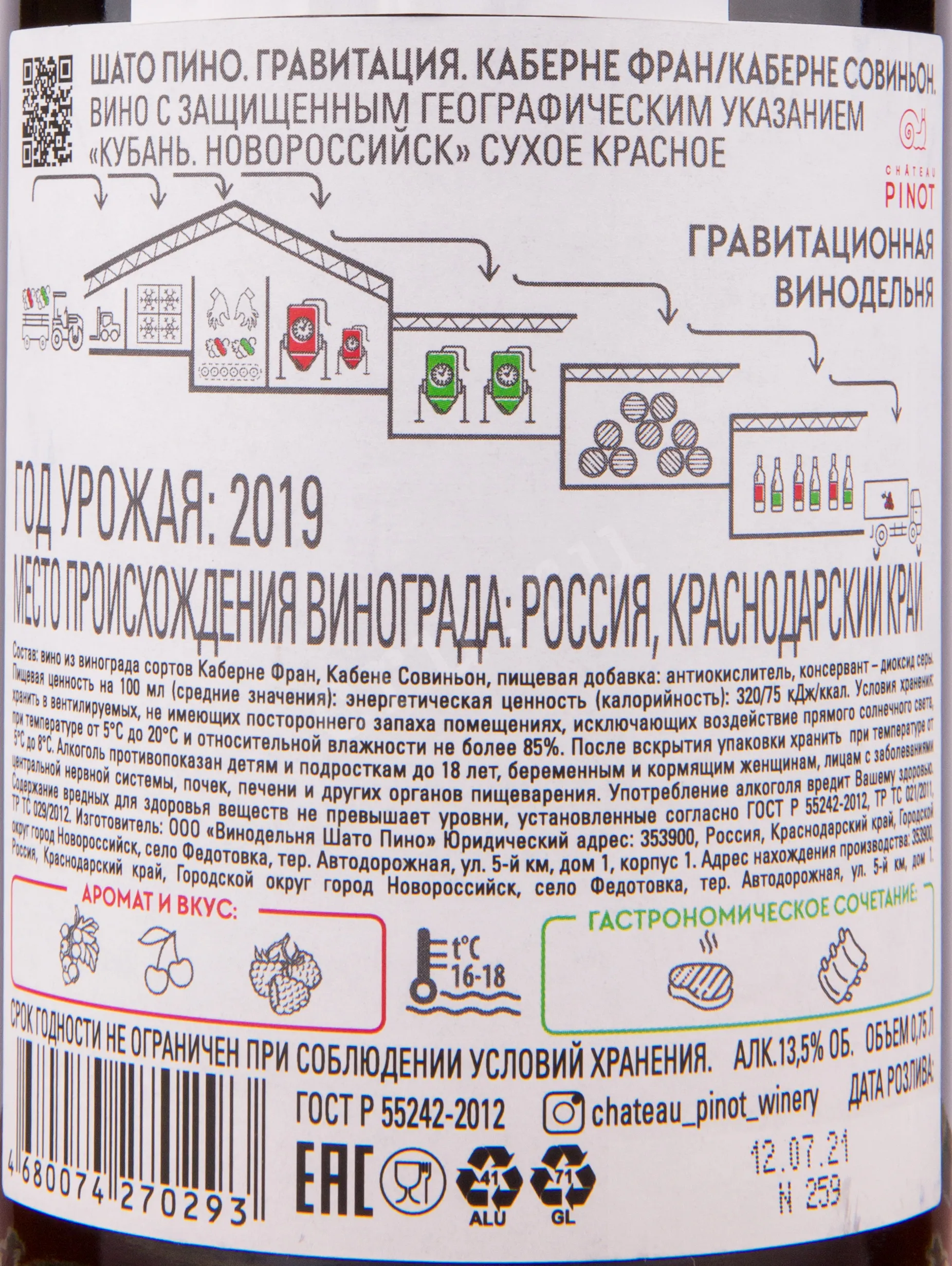 Вино Шато Пино Гравитация Каберне Совиньон 0,75 л создавалось с особым вниманием к терруару и технике обработки ягод. Урожай собирали вручную на солнечных склонах Краснодарского края, близ Новороссийска, где почвы содержат богатый минеральный состав, а климат с теплым днем и прохладной ночью обеспечивал идеальное созревание. Ягоды проходили мягкое прессование под действием силы тяжести, без использования насосов, что сохраняло чистоту вкуса и тонкость аромата. Ферментация происходила при строго контролируемой температуре, с минимальным вмешательством, позволяя проявиться естественной гармонии Каберне Совиньон.