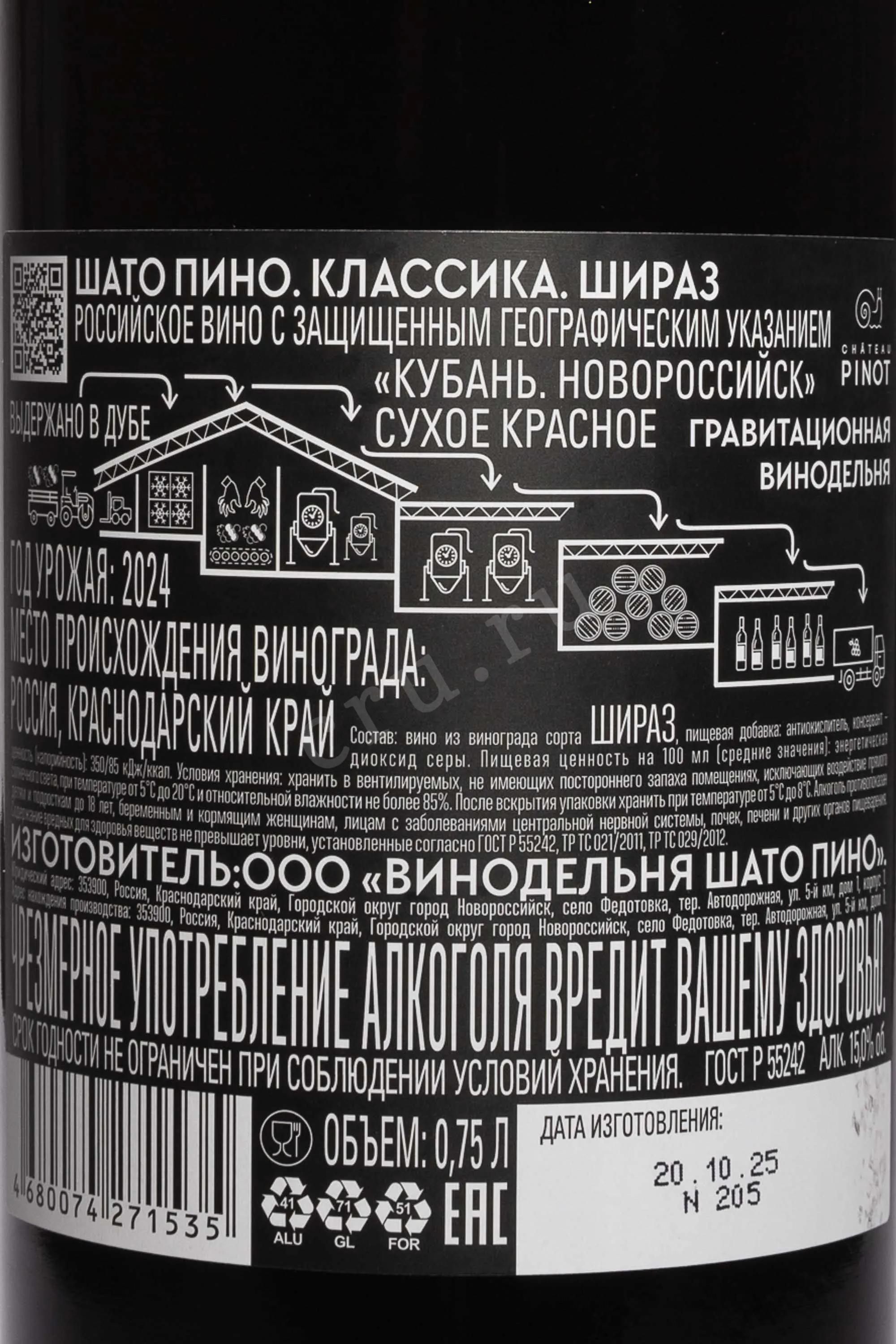 Красное сухое вино Шато Пино Классика Шираз 2024 г. 0,75 л родилось на виноградниках Краснодарского края, где теплый климат, продолжительное солнце и глинисто-известняковые почвы формируют насыщенный стиль южного темнокожего сорта. Урожай отличился ровным созреванием, поэтому ягоды собирали при оптимальном балансе сахара и кислотности. Винификацию провели по классической красной технологии: ферментация на кожице, контролируемая температура, мягкое прессование и последующая выдержка в стальных емкостях, позволяющая сохранить чистый сортовой букет. Миллезим выделяется плотной структурой, характерной пряностью и выразительной фруктовой линией без чрезмерной тяжеловесности.