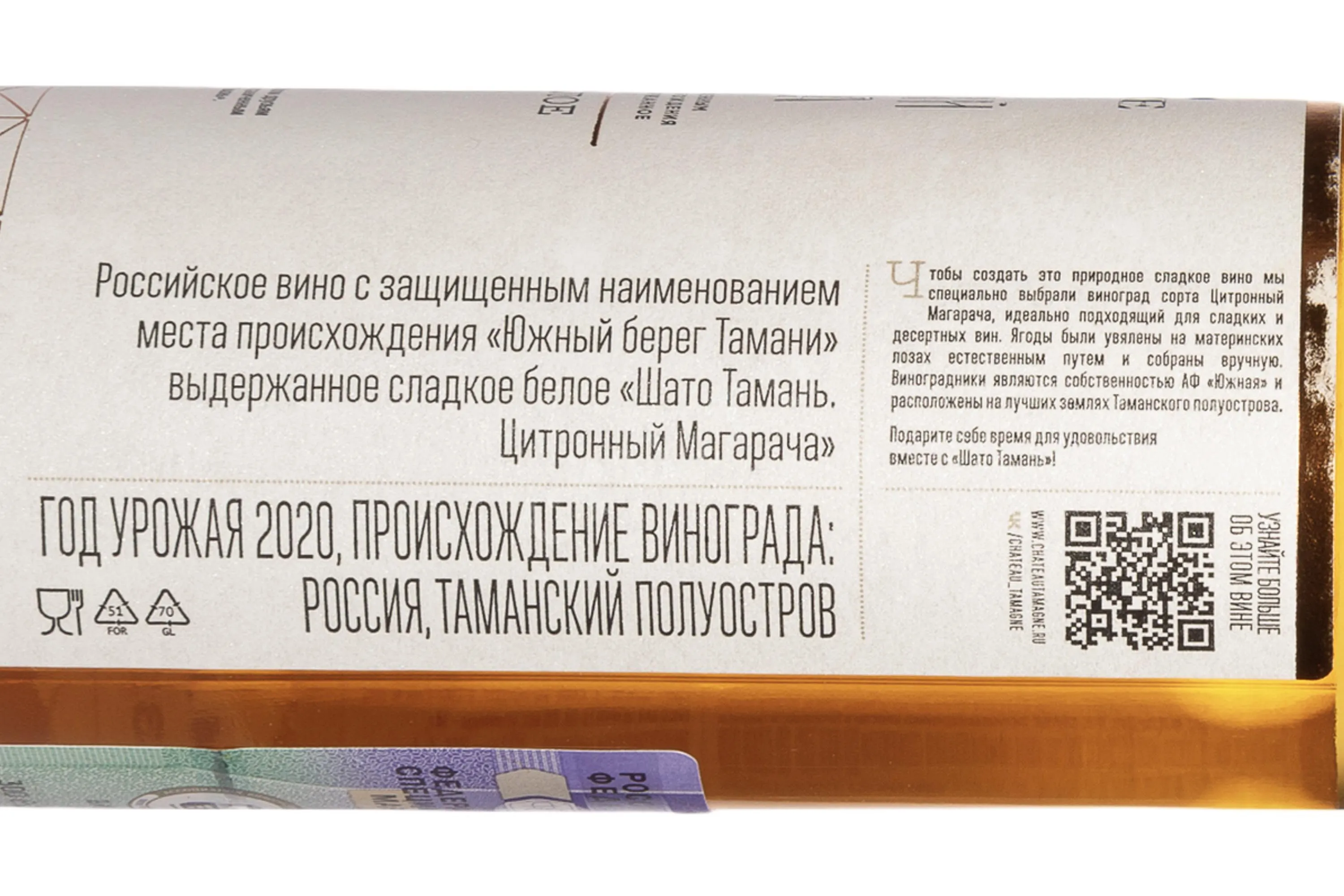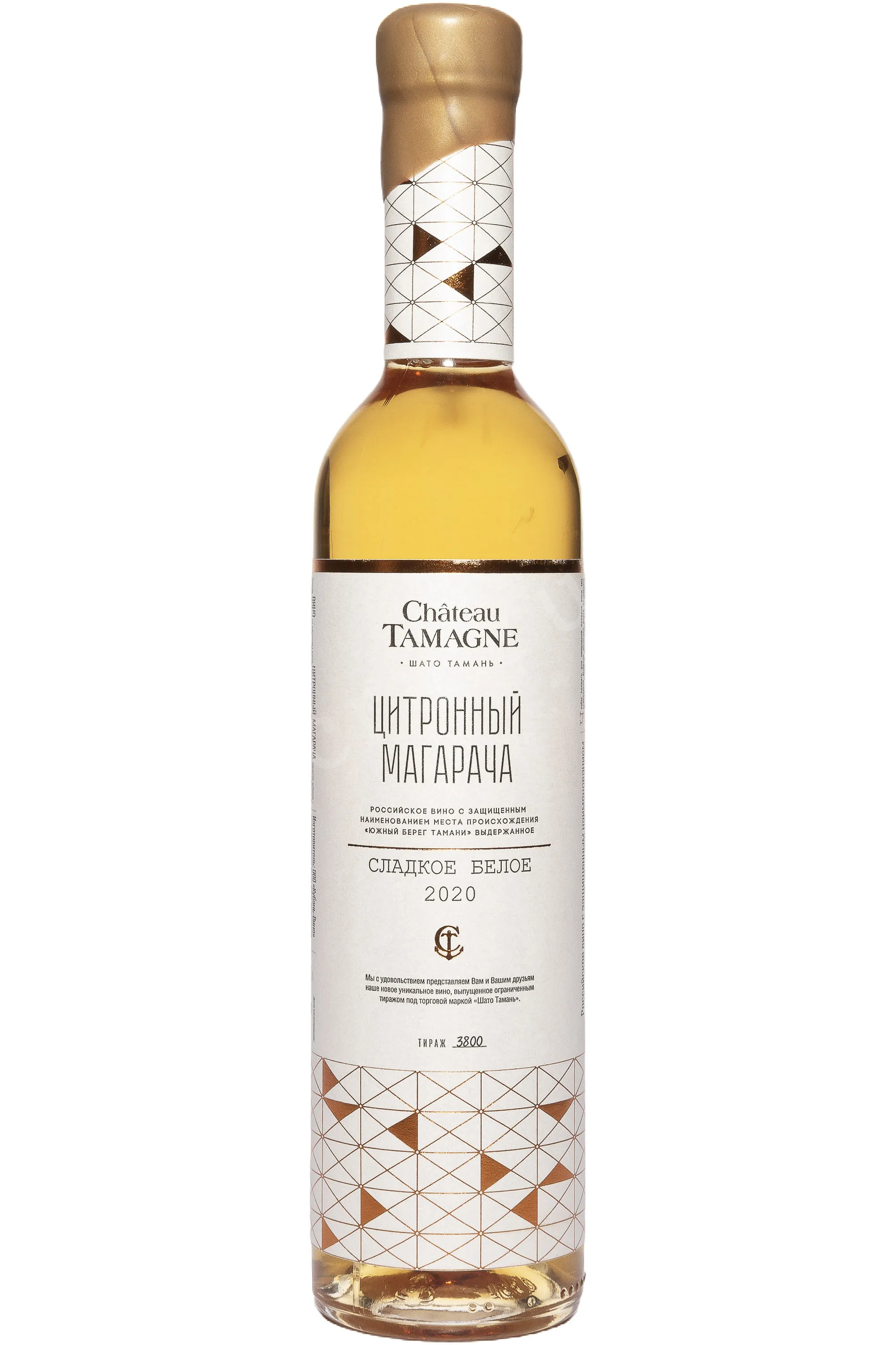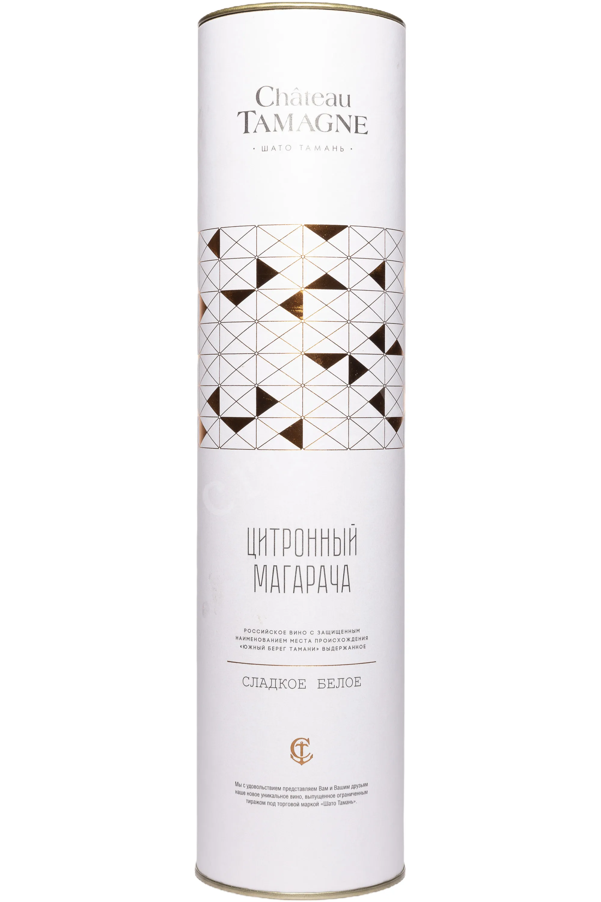 Вино Chateau Tamagne Citronnyj Magaracha in tube 2020 0.375 l — это белый сладкий российский алкоголь, выпускаемый в мини-сосудах объемом 375 мл в комплекте с подарочной тубой. Напиток создается из аборигенного сорта Цитронный Магарача. Ягоды собирают вручную во второй половине осени. После тщательной сортировки сырье подвергается деликатному прессованию. Полученный сок сбраживают при контролируемой температуре. Молодое вино созревает в стальных резервуарах в течение нескольких месяцев, а после подвергается фильтрации и стабилизации. Готовый напиток разливается по бутылкам при крепости 13% и уровне сахара 120-140 г/л.