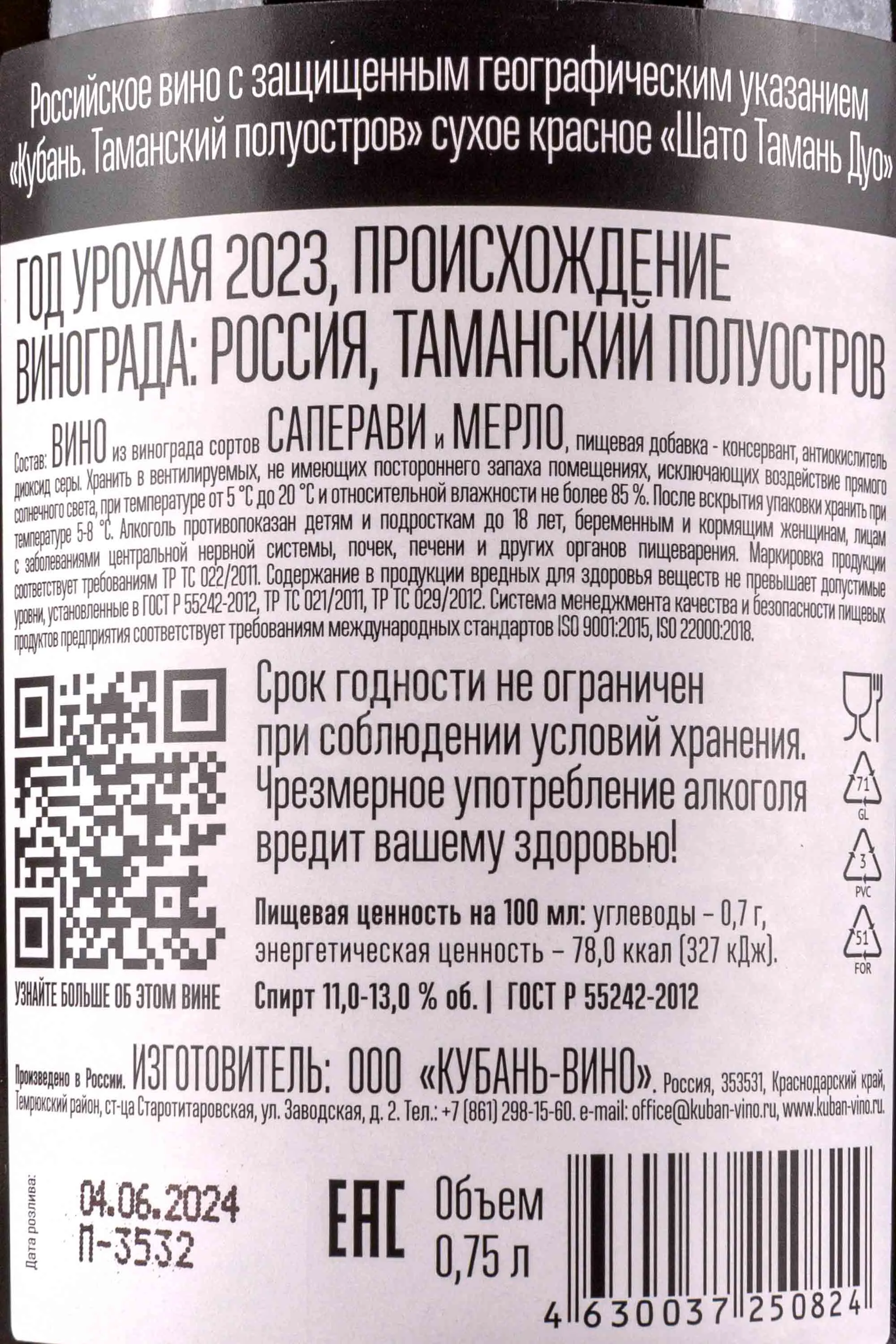 Вино Шато Тамань Дуо красное сухое 0,75 л — пример выдержанного подхода к созданию купажей, в котором технология и география выступают единым творческим инструментом. Производитель ООО «Кубань-Вино» работает в структуре ГК «Шато Тамань», охватывающей значительную часть Таманского полуострова, где виноградники занимают тысячи гектаров склонов, омываемых воздушными потоками сразу двух морей — Азовского и Чёрного. Такой терруар создаёт мягкий микроклимат, позволяющий Саперави и Мерло интенсивно накапливать ароматические компоненты. Поэтапная ферментация, контролируемая температура и деликатная выдержка дают напитку глубокий гранатовый тон и структурную гармонию, а акцент на сортовой выразительности формирует плотный, но округлый характер.