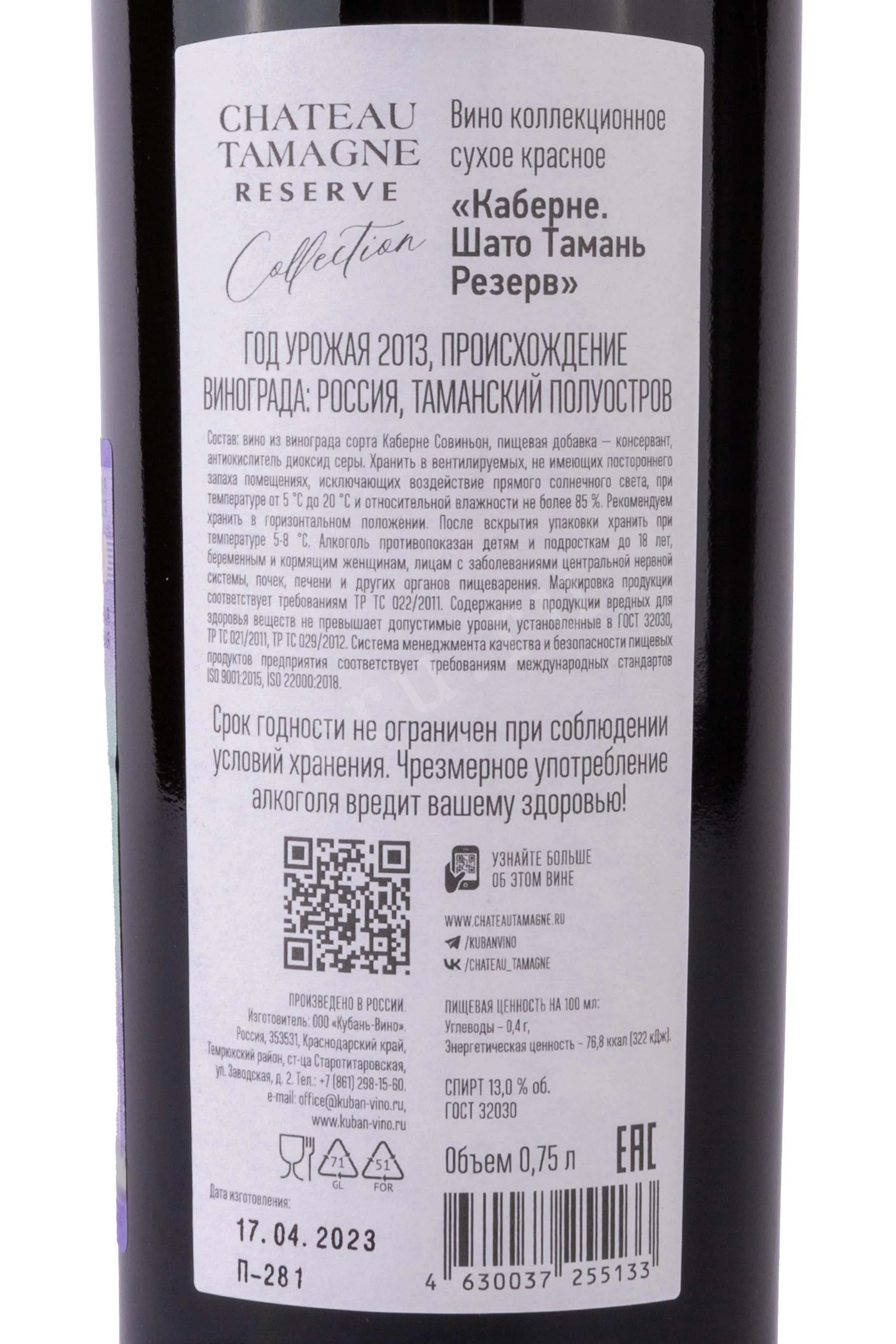 Вино Шато Тамань Резерв Каберне Совиньон 0,75 л — выдержанный образец красного сухого из коллекционной линейки хозяйства «Кубань-Вино», созданный из урожая собственных таманских виноградников. Лозы Каберне Совиньон возрастом около 20 лет растут на чернозёмных и карбонатных почвах Таманского полуострова, где близость Чёрного и Азовского морей формирует мягкий морской климат с продолжительным тёплым сезоном и выраженной солнечной инсоляцией. Урожай собирают в оптимальной фазе фенольной зрелости, после чего сусло ферментируют при контролируемой температуре. Около 33% объёма выдерживают в бочках из американского и французского дуба, оставшиеся 67% — в стальных резервуарах. После розлива напиток дополнительно созревает в бутылке не менее 60 месяцев, приобретая глубину и многослойность.