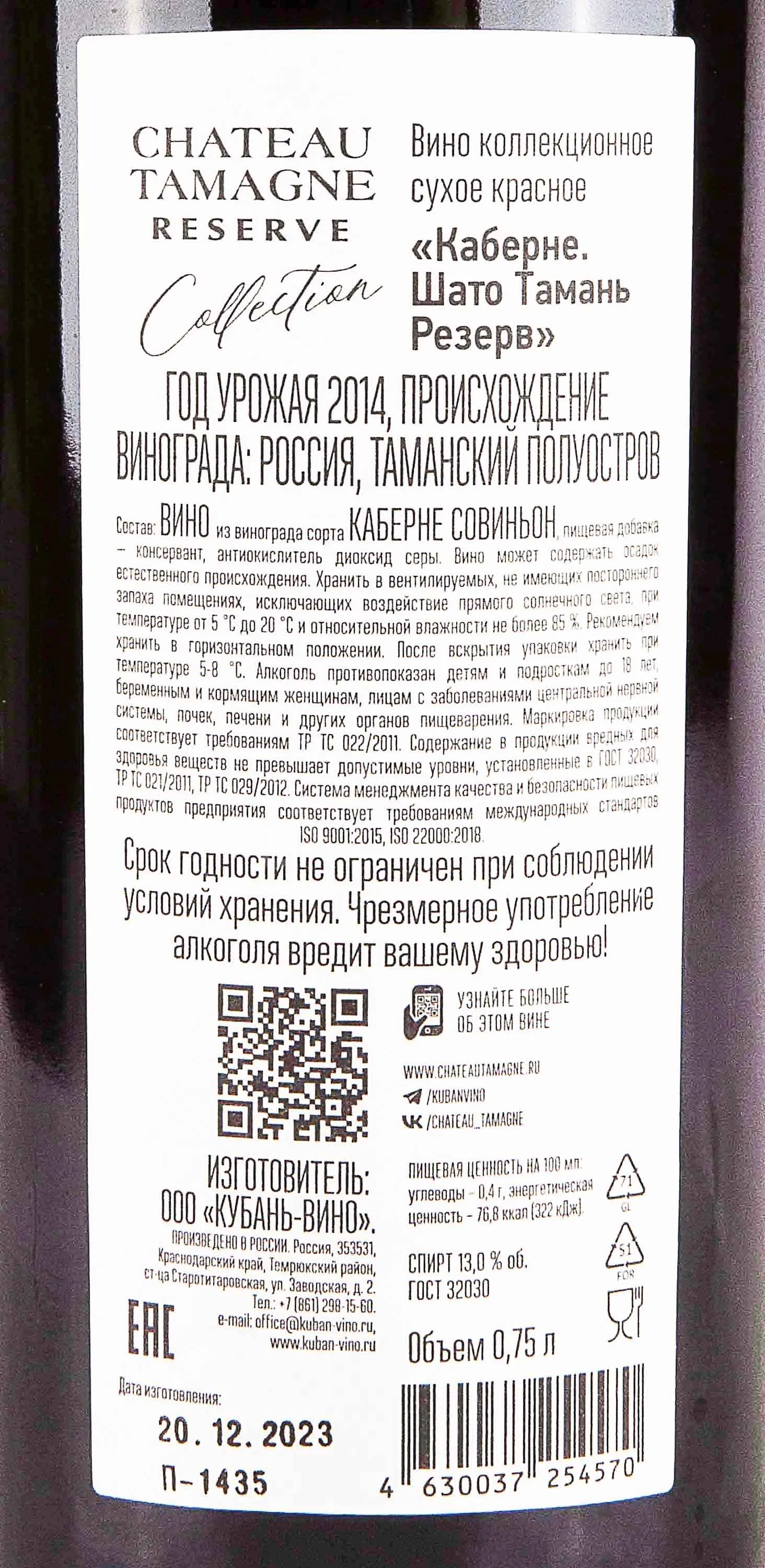 Шато Тамань Резерв Каберне 2014 0.75 л купить - Российское вино Chateau Tamagne Reserve Cabernet цена в магазине КРЮ ПРОФИ г. Москва, ул. Профсоюзная, д. 16/10 10:00-22:00 Ежедневно +7 (495) 920-20-02 info@cru.ru