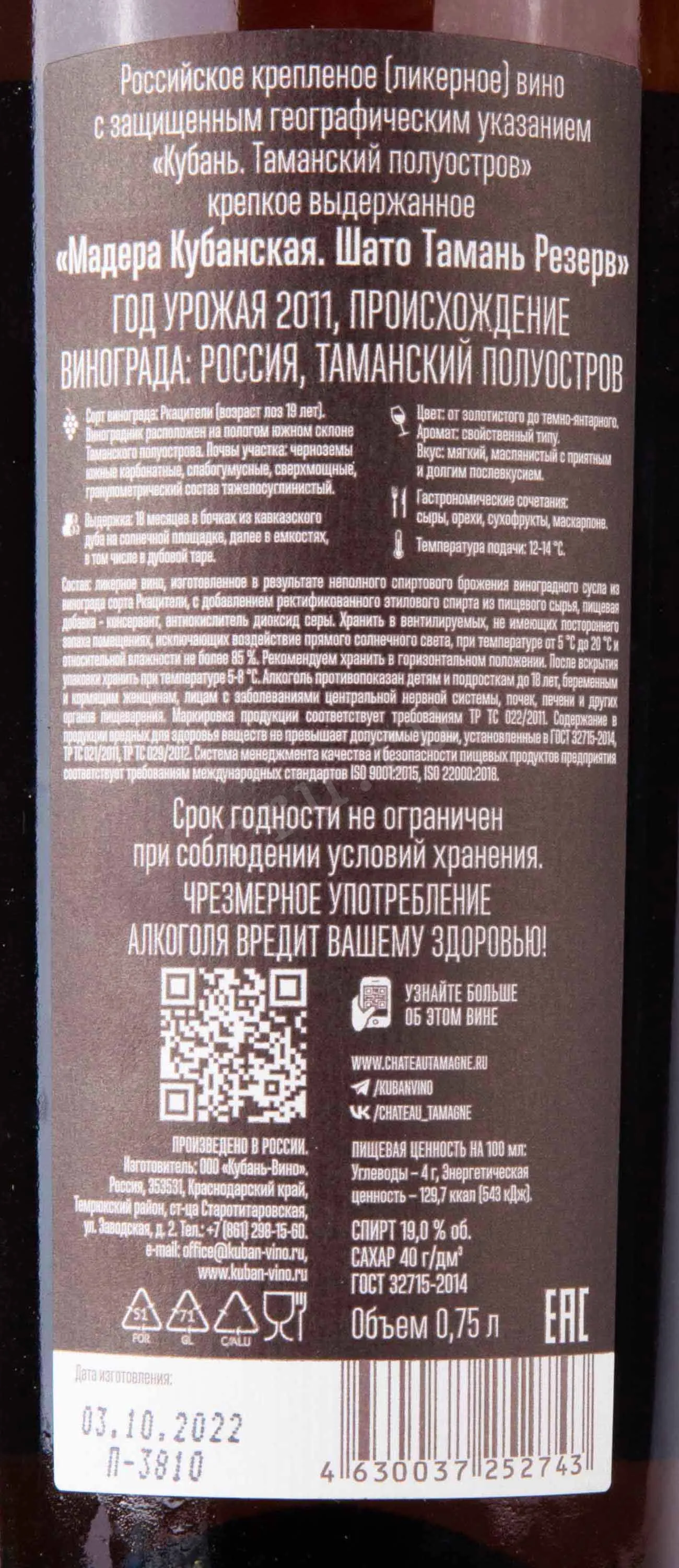 Вино Шато Тамань Резерв Мадера Кубанская 0,75 л создано на базе традиций кубанского виноделия с применением технологии, близкой к классической мадеризации. Производством занимается Кубань-Вино — одно из крупнейших хозяйств региона. После частичной ферментации сусло укрепляют винным спиртом, останавливая брожение и сохраняя естественную сладость. Далее напиток выдерживают по следующему принципу: бочки размещают на открытых площадках под солнечным теплом, что запускает контролируемое окисление и формирует характерные орехово-карамельные ноты. Выдержка проходит в бочках из кавказского дуба не менее 18 месяцев. Сырьё собирают на Таманском полуострове — в зоне с морским влиянием, известняковыми и чернозёмными почвами и большим количеством солнечных дней. Лозы сорта Ркацители возрастом около 25 лет дают концентрированный, насыщенный по экстрактивности материал. Цвет — светло-янтарный с золотистым отблеском, структура плотная и гармоничная.